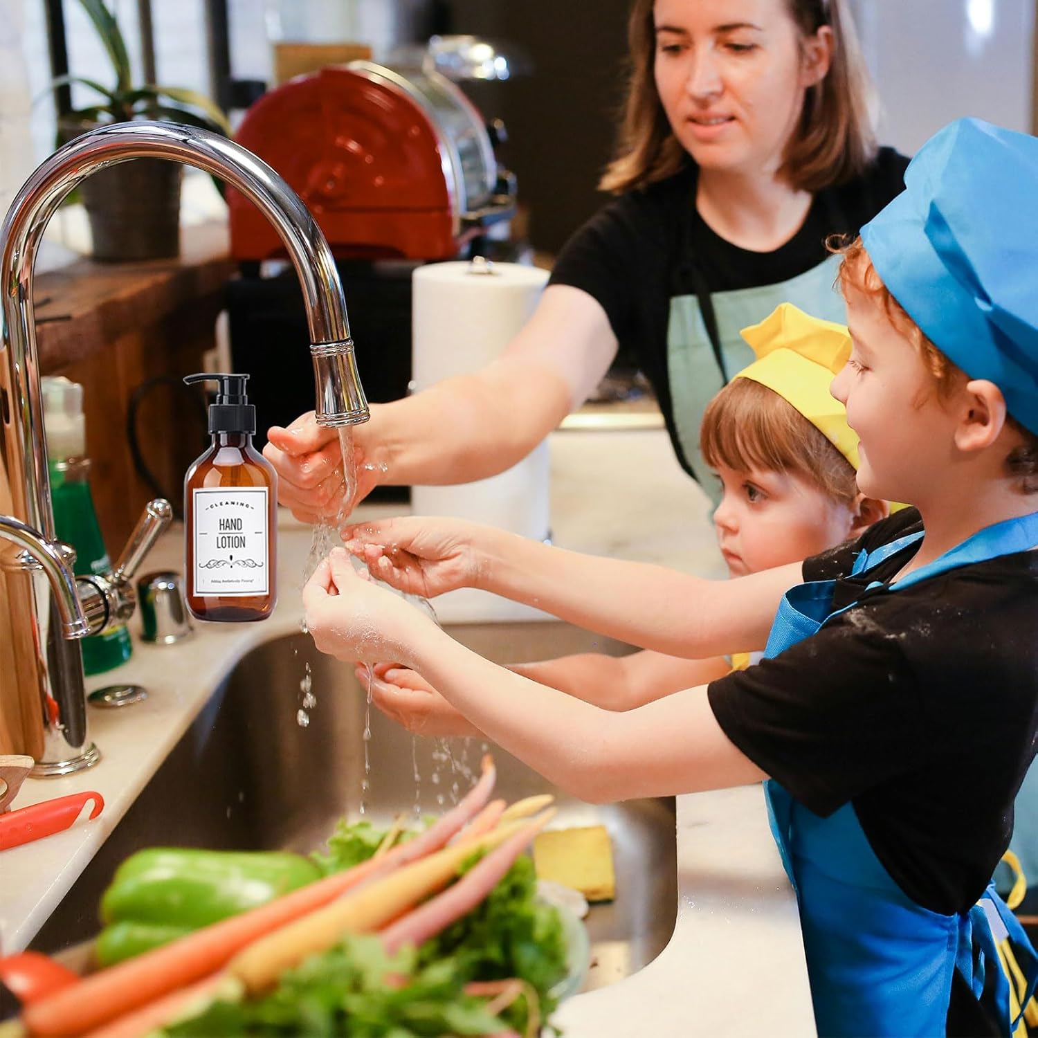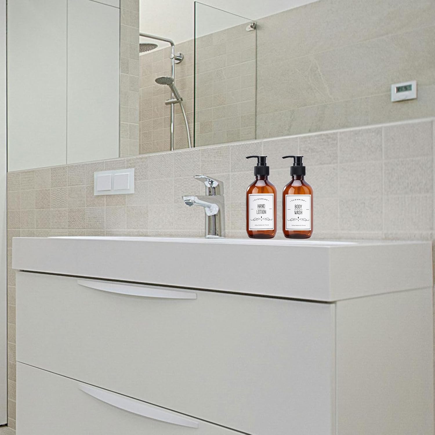 - Package include - 2 extra-thick plastic amber soap dispenser bottles with pump which can hold 16 oz, 12 Hand Soap, Dish Soap, Lotion waterproof labels for you choose