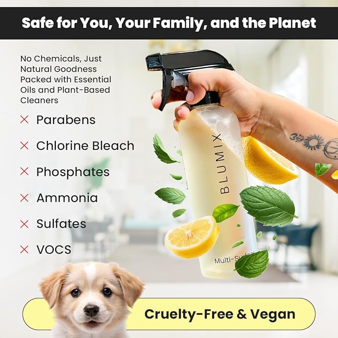 - Essential Oil-Enhanced Tablets: The kit includes 4 tablets – 2 fresh lemon-scented and 2 eucalyptus-scented. Each tablet dissolves in the 16.9 Oz spray bottle to create a gentle yet effective all-purpose cleaning solution great for tackling everyday messes.