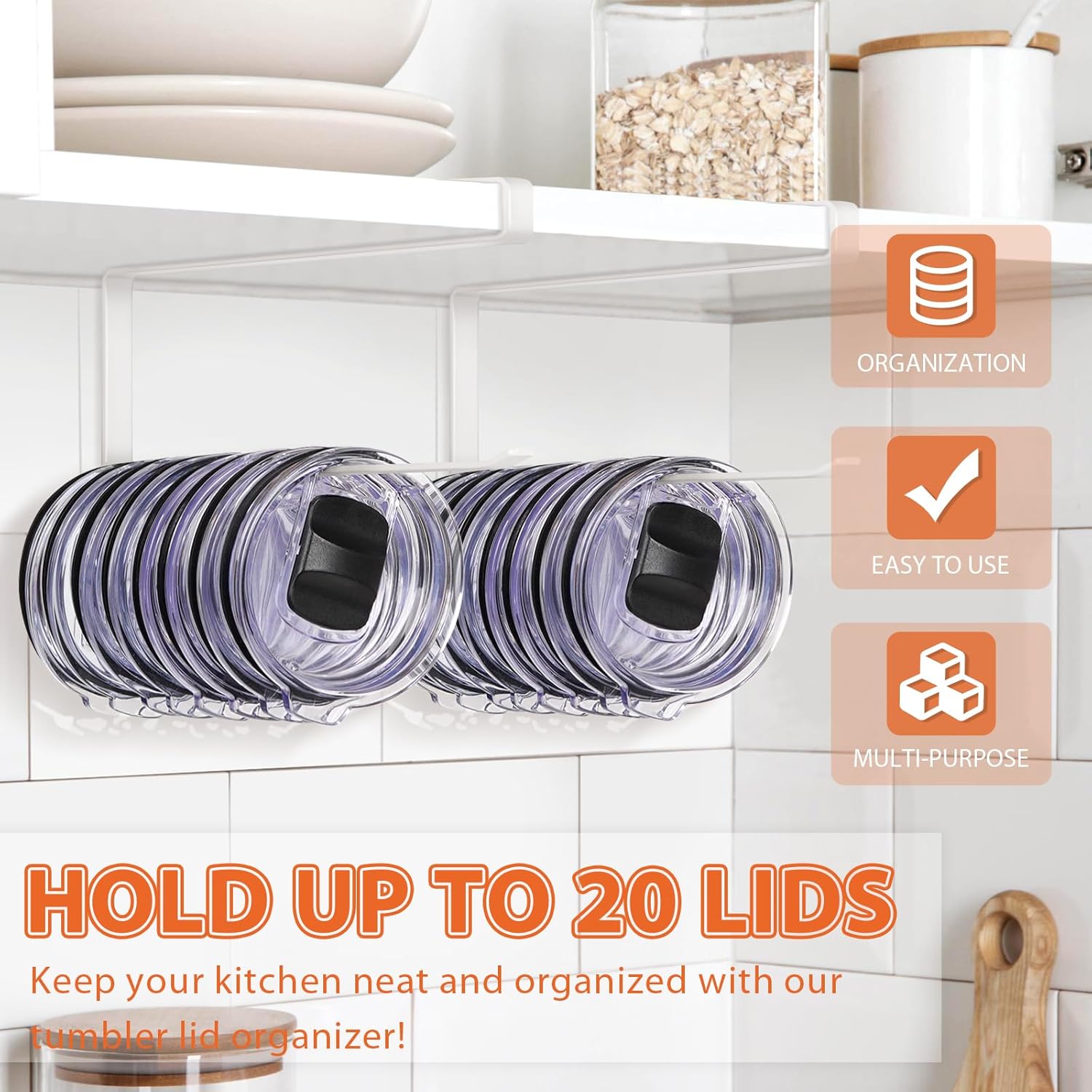 - Hold Up to 20 Lids: 2 PCS Package! Our cup lid holder storage is capable of accommodating up to 20 tumbler lids(can not store straw lids). The Tumbler lid organizer hook perfectly matches drinking tumbler lids' sizes and brands. Maximizing your need for kitchen organization space.