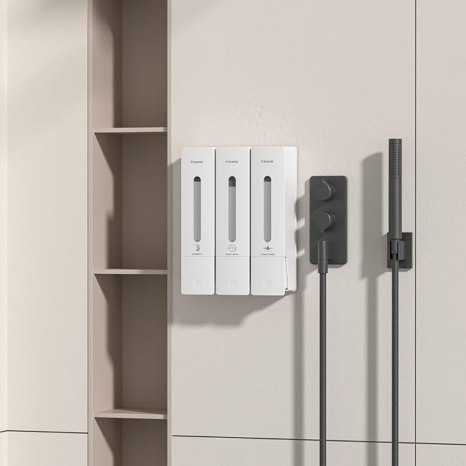 - ✅LESS CLUTTER - Pobamle's wall mounted pump soap dispenser perfectly organizes your shampoo, conditioner, body wash, or whatever else you need to enhance your bathing experience, with multiple liquids at your fingertips.