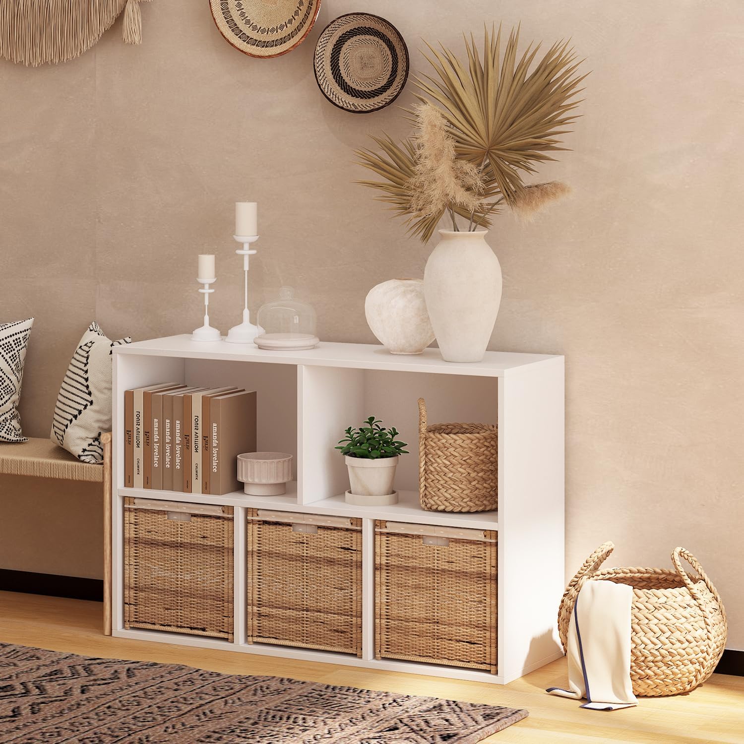 - Versatile Storage Solution: Perfect for use in the study, bedroom, living room, kitchen, or hallway, this 5 cube organizer offers practical storage space for books, decor, and other essentials. Enhance your home storage with this sleek and functional furniture piece.Please Note: All accessories in the cube organizer (storage bins/boxes, hanging paintings, cups, books, etc.) are not included.