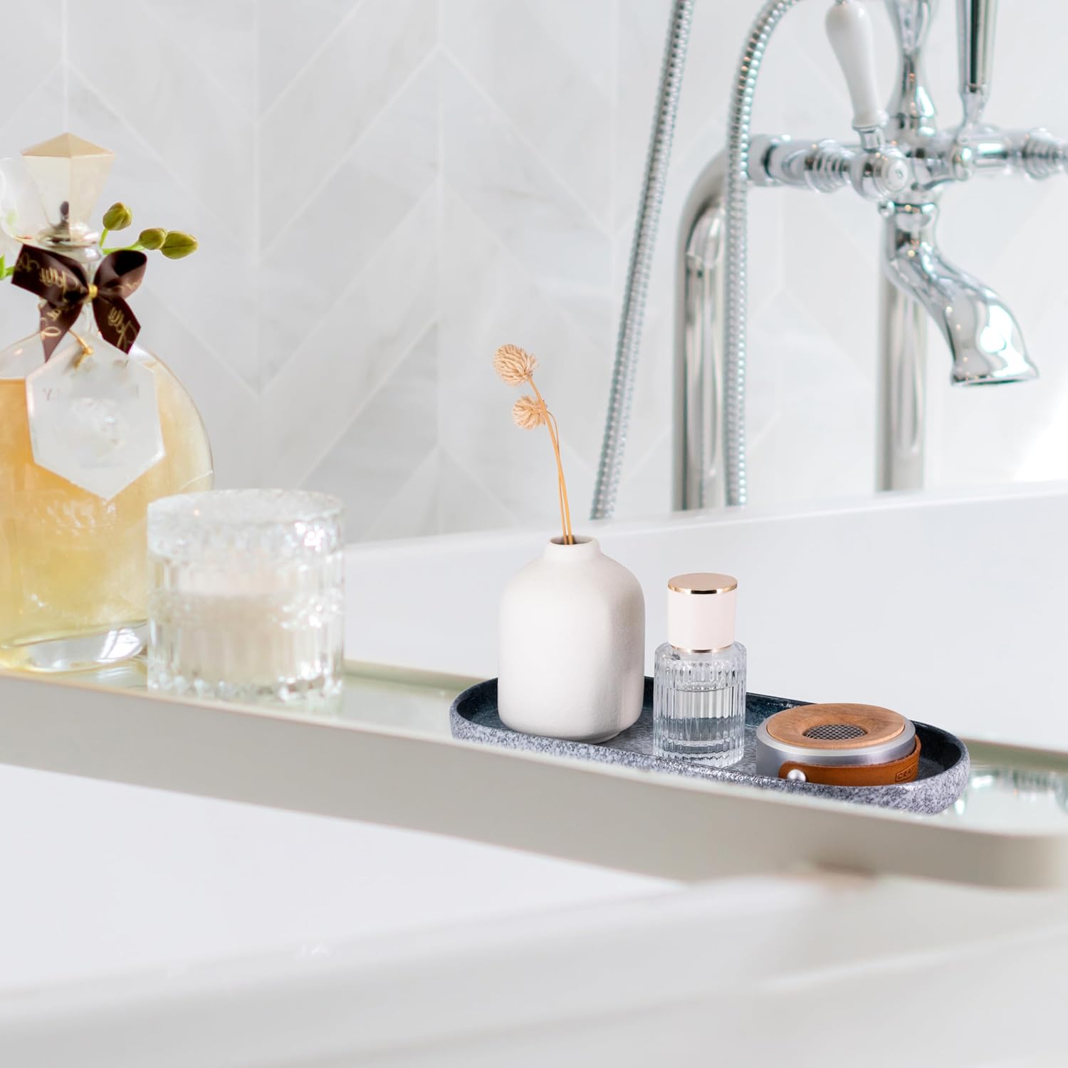 - Say Goodbye to Cluttered Countertops: Tired of messy vanity tops, bathroom vanities, and kitchen sink countertops? Try our large tray, perfect for organizing perfume, candles, shampoo and lotion bottles, jewelry, cosmetics, and toiletries. It’s also ideal for keeping your kitchen sink area tidy. Transform your space and enjoy a clutter-free environment with this versatile organizer.