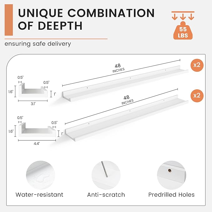 Floating Picture Ledge Shelves Set of 4, 48 Inch Shelves with Lip - Large Nursery Book Shelf for Toys Storage, Kids Bookshelf Wall Mounted Living Room Bedroom Decor Frames
