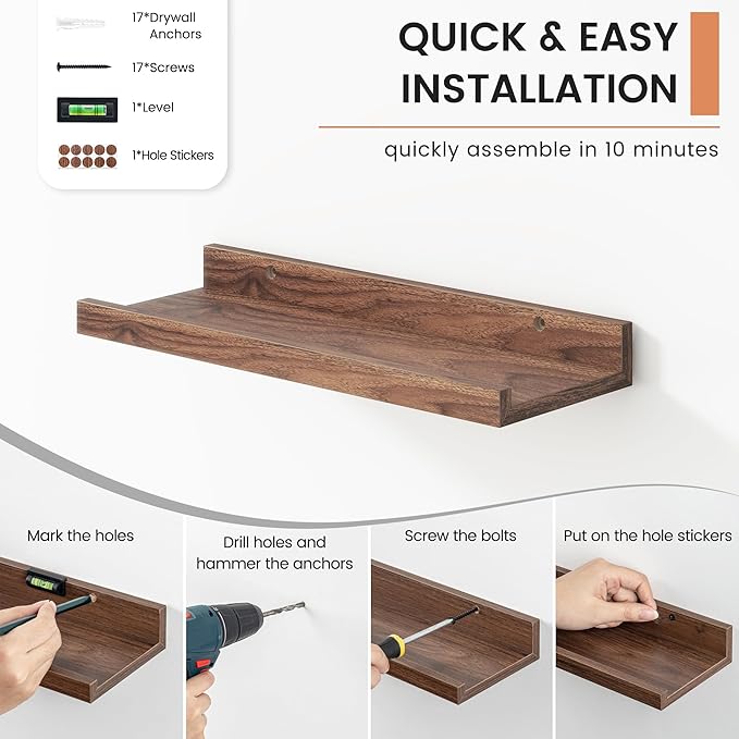 • 【Easy to Install】FLYJOE picture ledge shelves are quick and easy to install! Each set comes with pre-drilled holes and all necessary hardware, including a mini level for perfect alignment. With simple instructions, you can have your shelves up in minutes, allowing you to start decorating right away