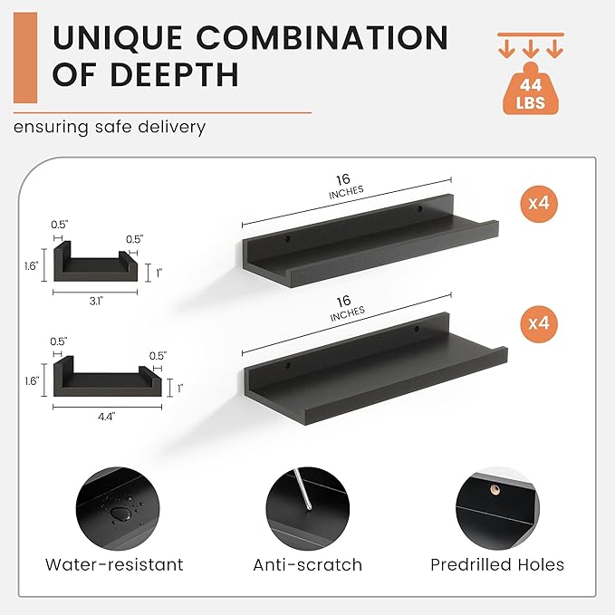 • 【Versatile and Multi-Functional】These shelves aren’t just for photos! FLYJOE ledge shelves can be creatively used as kids' bookshelves, display shelves for collectibles, spice racks in the kitchen, or even over-the-toilet storage in the bathroom. Their adaptability makes them a practical choice for any room in your home
