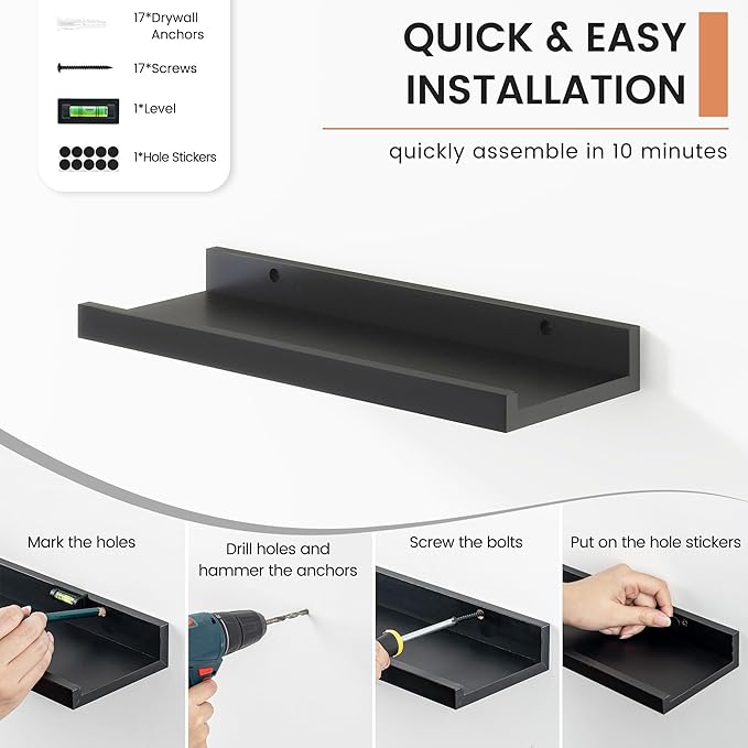 • 【Easy to Install】FLYJOE picture ledge shelves are quick and easy to install! Each set comes with pre-drilled holes and all necessary hardware, including a mini level for perfect alignment. With simple instructions, you can have your shelves up in minutes, allowing you to start decorating right away