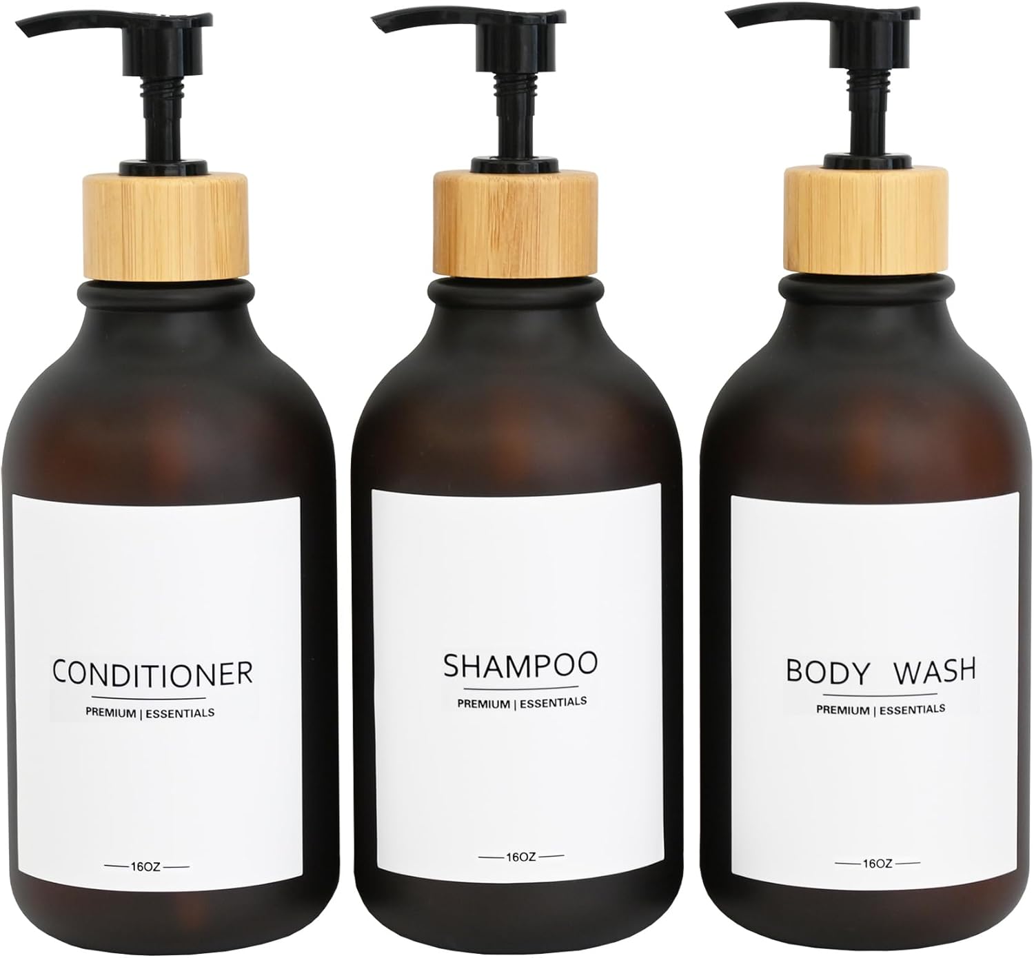 Frosted Plastic Shampoo and Conditioner Bottles, Apothecary Dispenser Bamboo Pump, Refillable Bottles for Shower Lotion, Oil, Hand Soap, Sanitizer, Liquid Soap, Set of 3 with 9 Labels (3, Matte Amber)