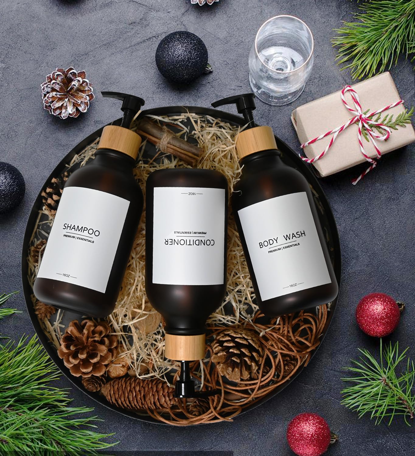 - Includes - 3 extra-Thick Frosted PET plastic bottles and 9 waterproof labels including HAND SOAP, DISH SOAP, LOTION, SHAMPOO, CONDITIONER, BODY WASH,FACE WASH, SANITIZER, CLEANSER for Shampoo, and other usage scenarios. The matte surface design and high-quality materials make it a stylish addition to any bathroom decor.