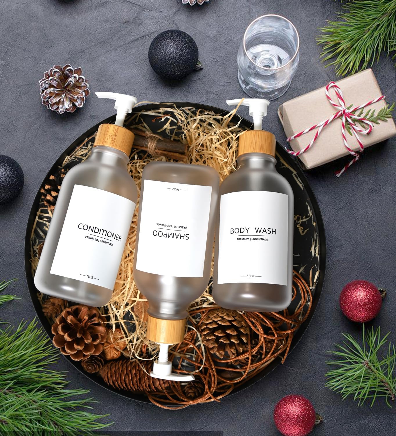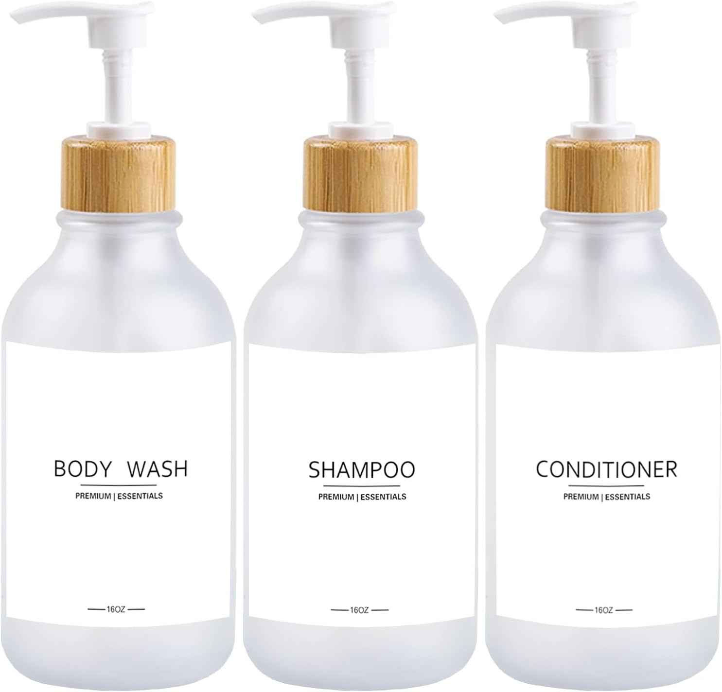 Frosted Plastic Shampoo and Conditioner Bottles, Apothecary Dispenser Bamboo Pump, Refillable Bottles for Shower Lotion, Oil, Hand Soap, Sanitizer, Liquid Soap, Set of 3 with 9 Labels (3, Matte Clear)