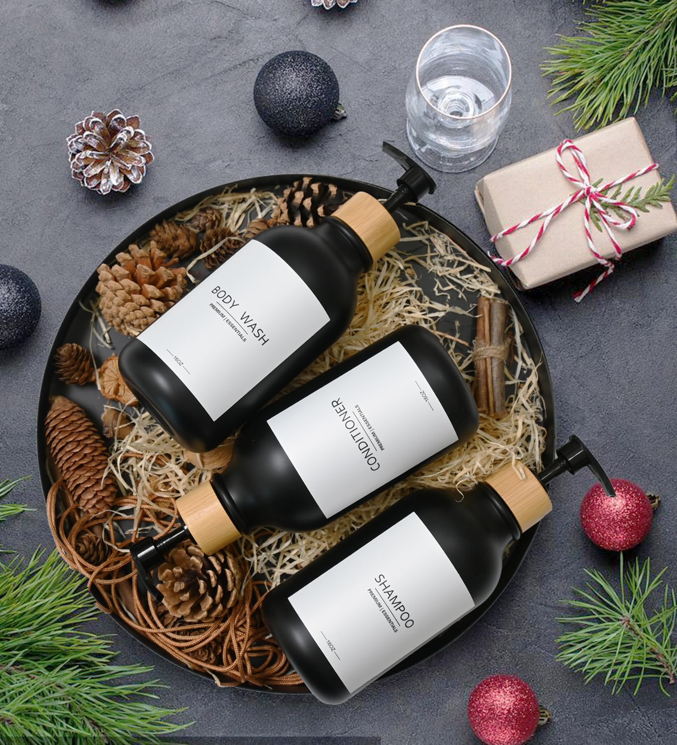 Frosted Plastic Shampoo and Conditioner Bottles, Apothecary Dispenser Bamboo Pump, Refillable Bottles for Shower Lotion, Oil, Hand Soap, Sanitizer, Liquid Soap, Set of 3 with 9 Labels (6, Matte Black)