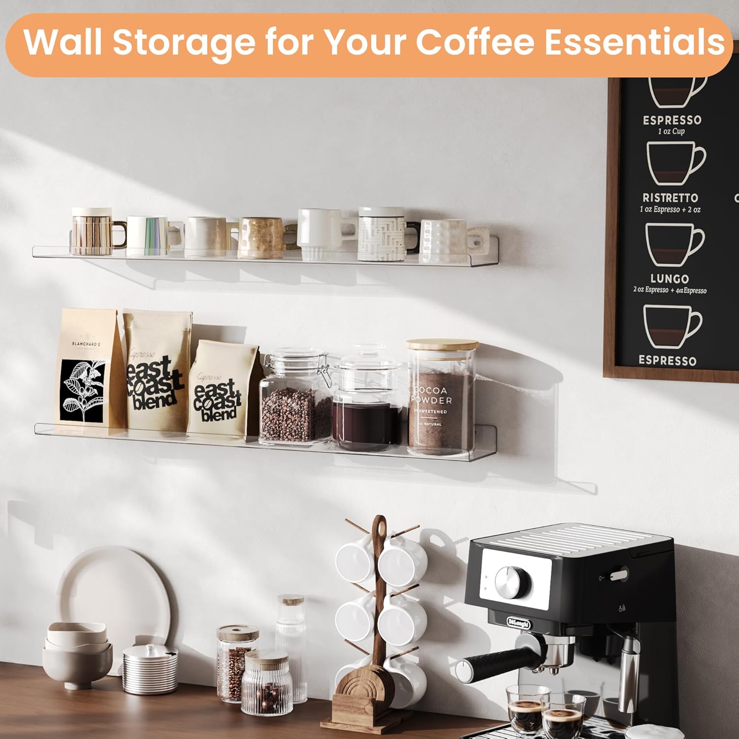 upsimples 2 Pack 35.5x5.5 Inches Acrylic Shelves for Wall Storage, Floating Bookshelves for Kids, Display Shelf Organizer for Bathroom, Bedroom, Living Room, Kitchen, Clear