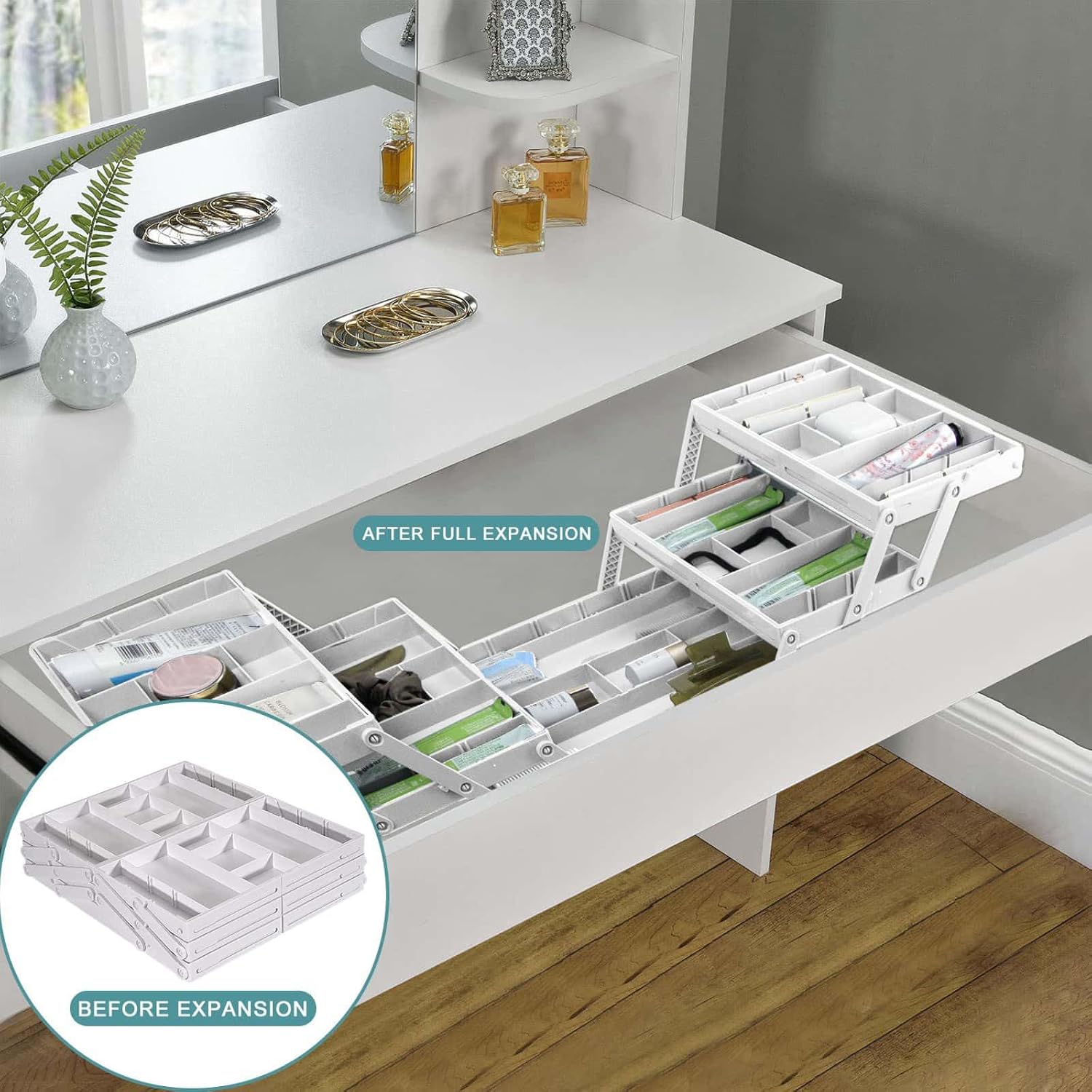 Aobiono Multi Level Smart Drawer Organizer, Multi Tier Expandable Storage Collapsible Foldable Trays for Jewelry, Cosmetics, Makeup, Tools, Battery (White, Double Row - 3 Levels)