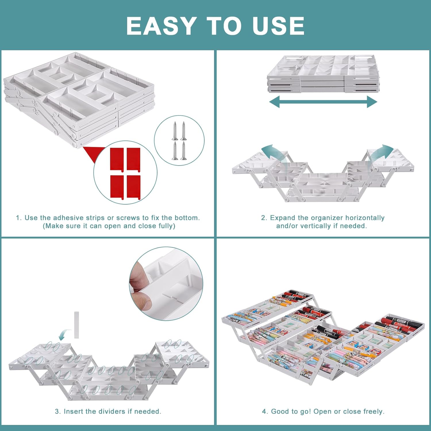 - Versatile & Expandable Neat Storage: Perfect for cosmetics, jewelry, office supplies, crafting and sewing supplies, miscellaneous, odds and ends, toiletries, stationery, tools, batteries, flatware, and kitchen utensils with a collapsible 2-tier or 3-tier design and adjustable dividers.