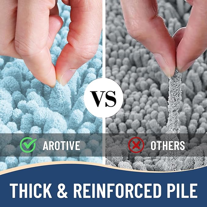 - Anti-Skid Backing: Arotive chenille bathroom rugs feature a non-slip bottom consisting of sturdy mesh PVC material that stops the bath mat from shifting and skidding. The middle layer is 4 mm memory foam, which can let you feel more comfortable when wrapping into the rugs. WARNING: Place bath mat on CLEAN DRY FLAT FLOOR ONLY. Water under bath rug can cause it to slip. Always keep the bottom of bath rug dry