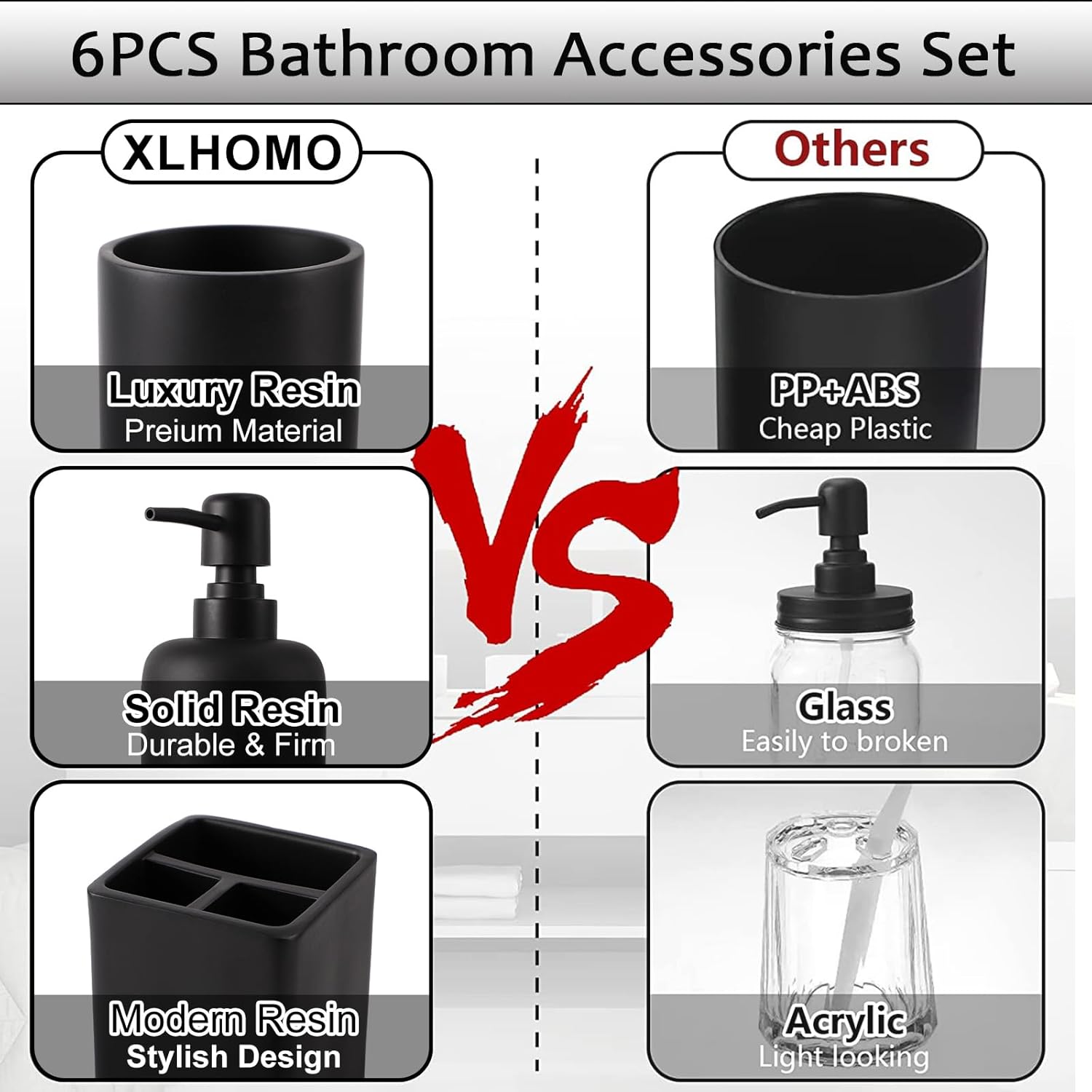 - RESIN BLACK BATHROOM ACCESSORIES SET COMPLETE - Our bathroom set includes 1 x soap dispenser, 1 x toothbrush holder, 1 x vanity tray, 1 x bathroom tumbler, and 2 x apothecary jars. A complete set of all-in-one bathroom essentials that are easily accessible!