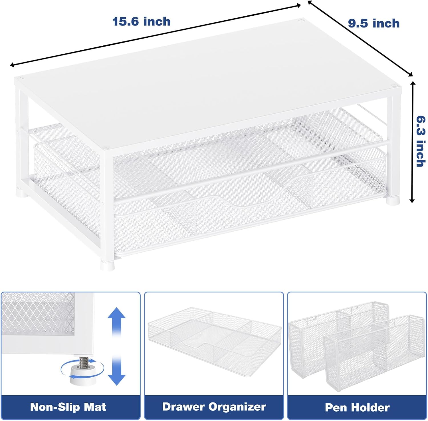 - 【Save Space】:This 2-Tier monitor stand with drawer and 2 hanging pen holders provides ample storage space to keep your office supplies and office desk accessories neatly organized and easily accessible, keeping your workspace tidy and improving your sense of well-being