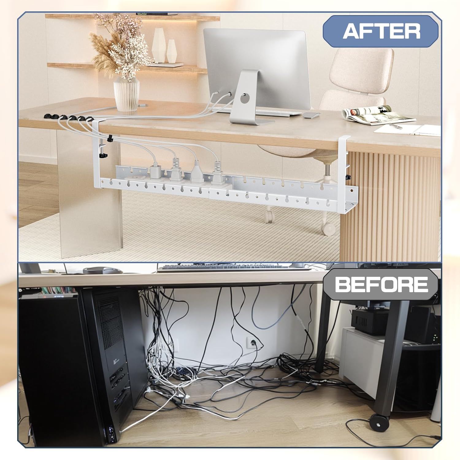 - 【Space-saving Design】: Keep your desktop clutter-free with this adjustable, no-drill, easy-to-install and remove under desk cable management tray that holds multiple power strips and chargers. The C-clamps with adhesive anti-friction pads hold it in place without damaging the desk.