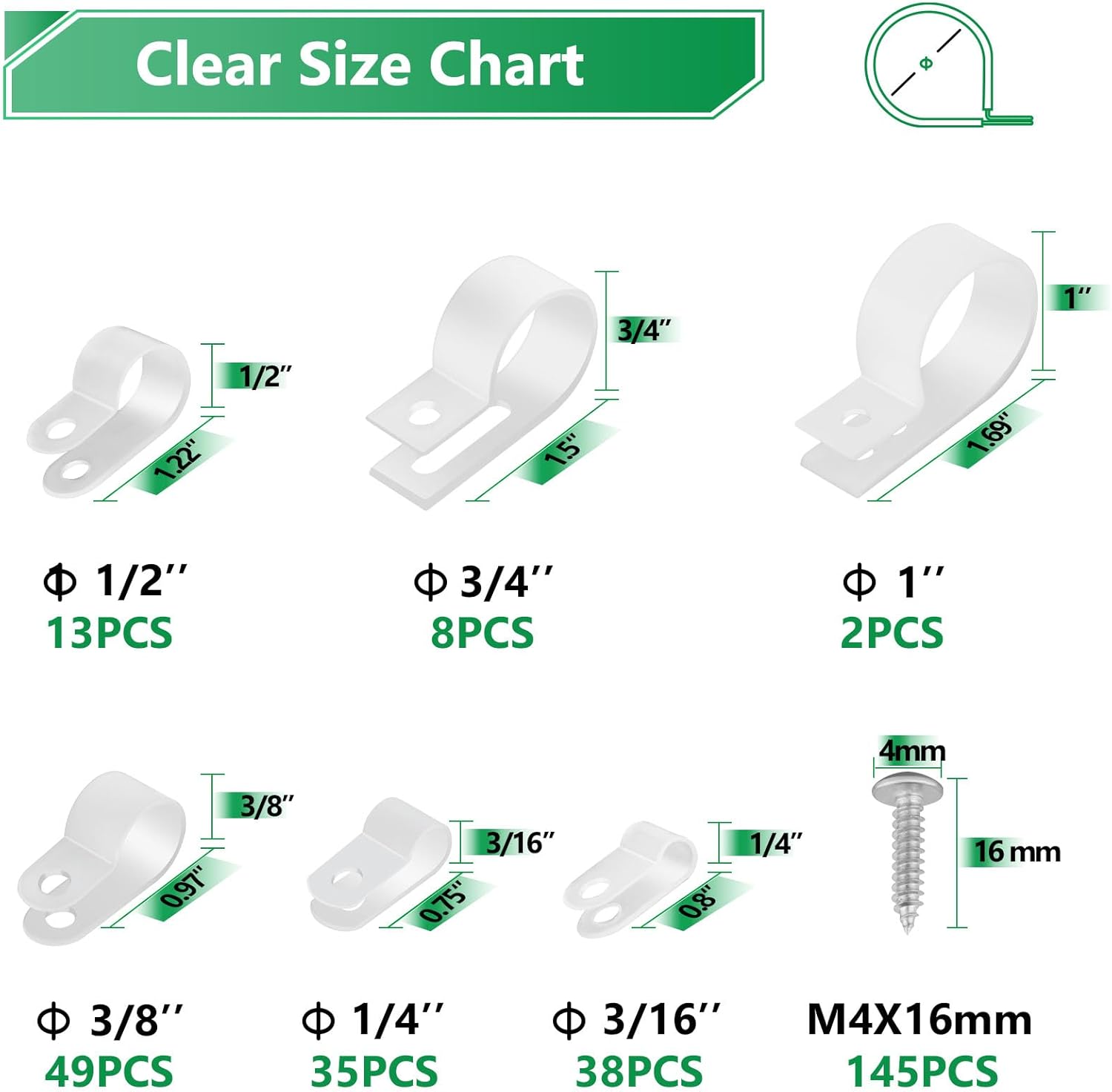 - 【Best Combination Set】 – There are a total of 145 pieces nylon R-type cable clamp in 6 sizes: 3/16’’ 1/4’’ 3/8’’ 1/2’’ 3/4’’ 1’’. These sizes contain almost the 6 most commonly used sizes in our life, such as TV cords, routing cables, snowmobile wires, LAN cables, Ethernet cable, computer and electrical power cables , desk wall cables.