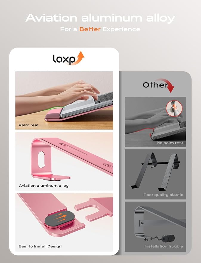 - 【Solid and Sturdy Metal Stand】This laptop wrist support is designed by engineers of loxp based on the concept of triangle stability. Three different force points provide strong support for your laptop device. All three sides are made of durable and tight aluminum alloy material. It is detachable and does not require screws. It is easy to assemble and disassemble. You can use it as a travel laptop stand because it is easy to carry.