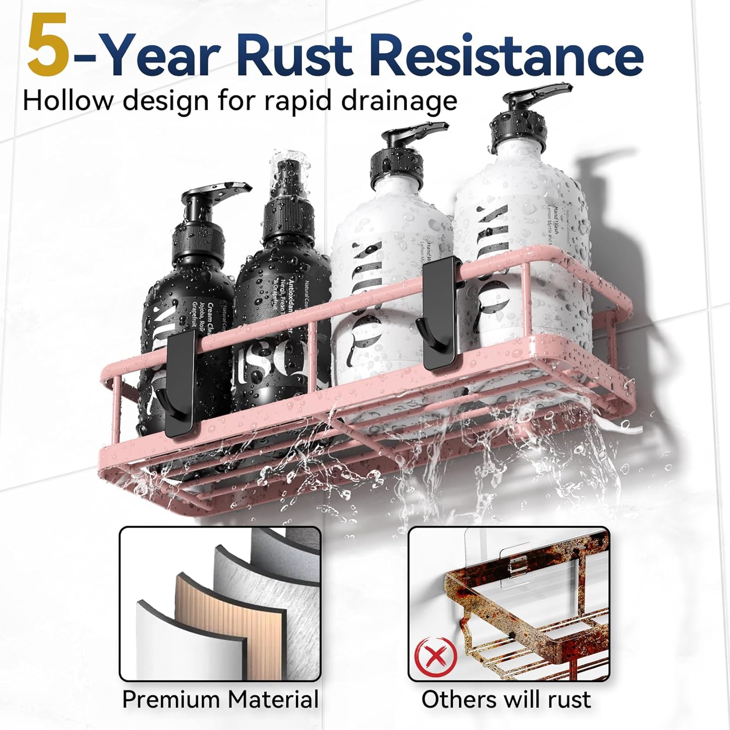 - 【Durable Metal, Rustproof Design】 - The bathroom shower organizer is made of high quality metal and high temperature paint technology, which is durable, rust resistant, waterproof, and scratch resistant. Can stay with you for up to 6 years. Hollow design at the bottom, good ventilation and drainage, convenient cleaning. Keep shower shelves and bathroom necessities dry.