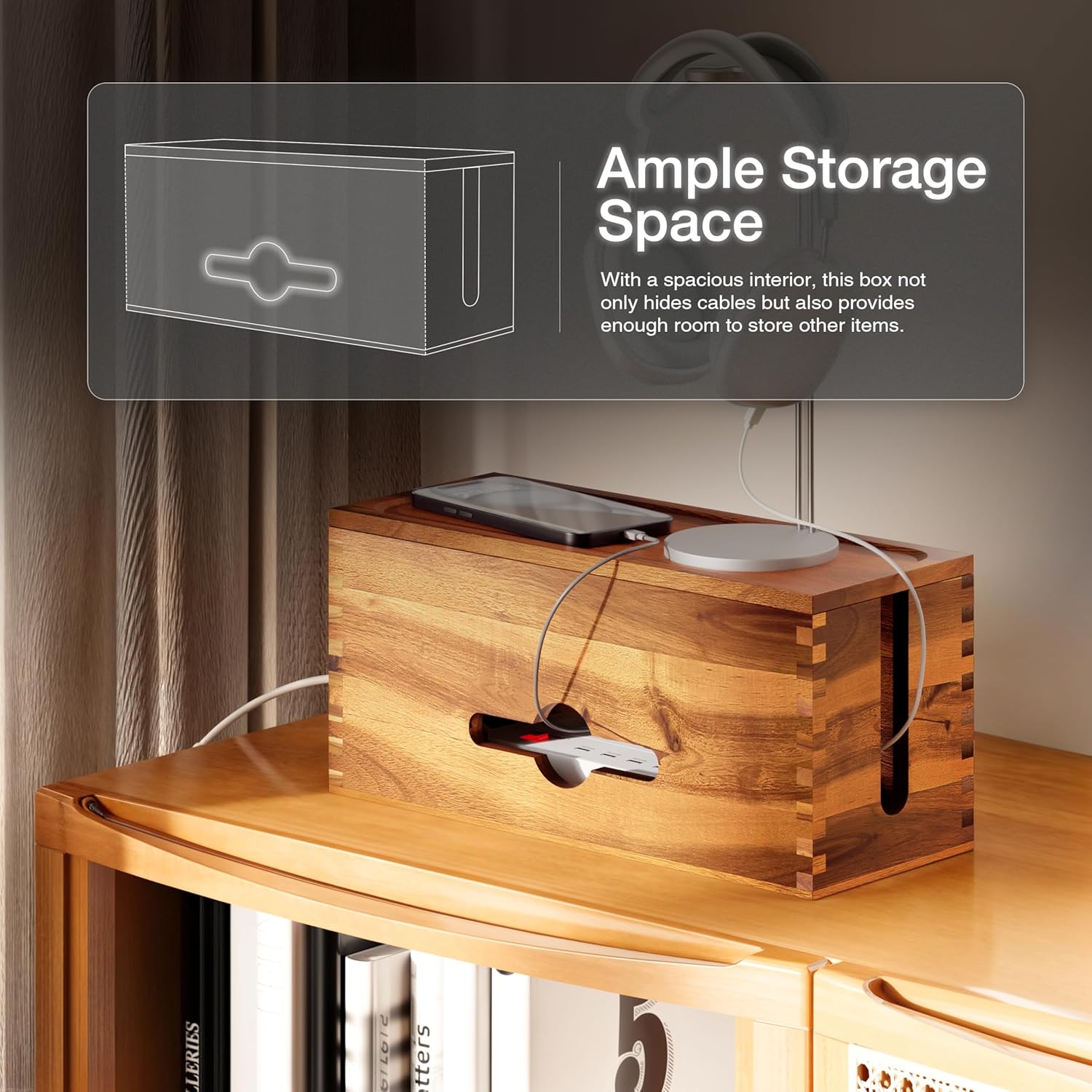 - High-Quality Acacia Wood: Crafted from durable acacia wood with a smooth natural finish, this cable management box is built to withstand daily use while adding understated sophistication to any space. Its generous 15"L x 6"W x 6.9"H size accommodates most power strips, surge protectors, and excess cables—keeping your setup tidy without taking up unnecessary room.
