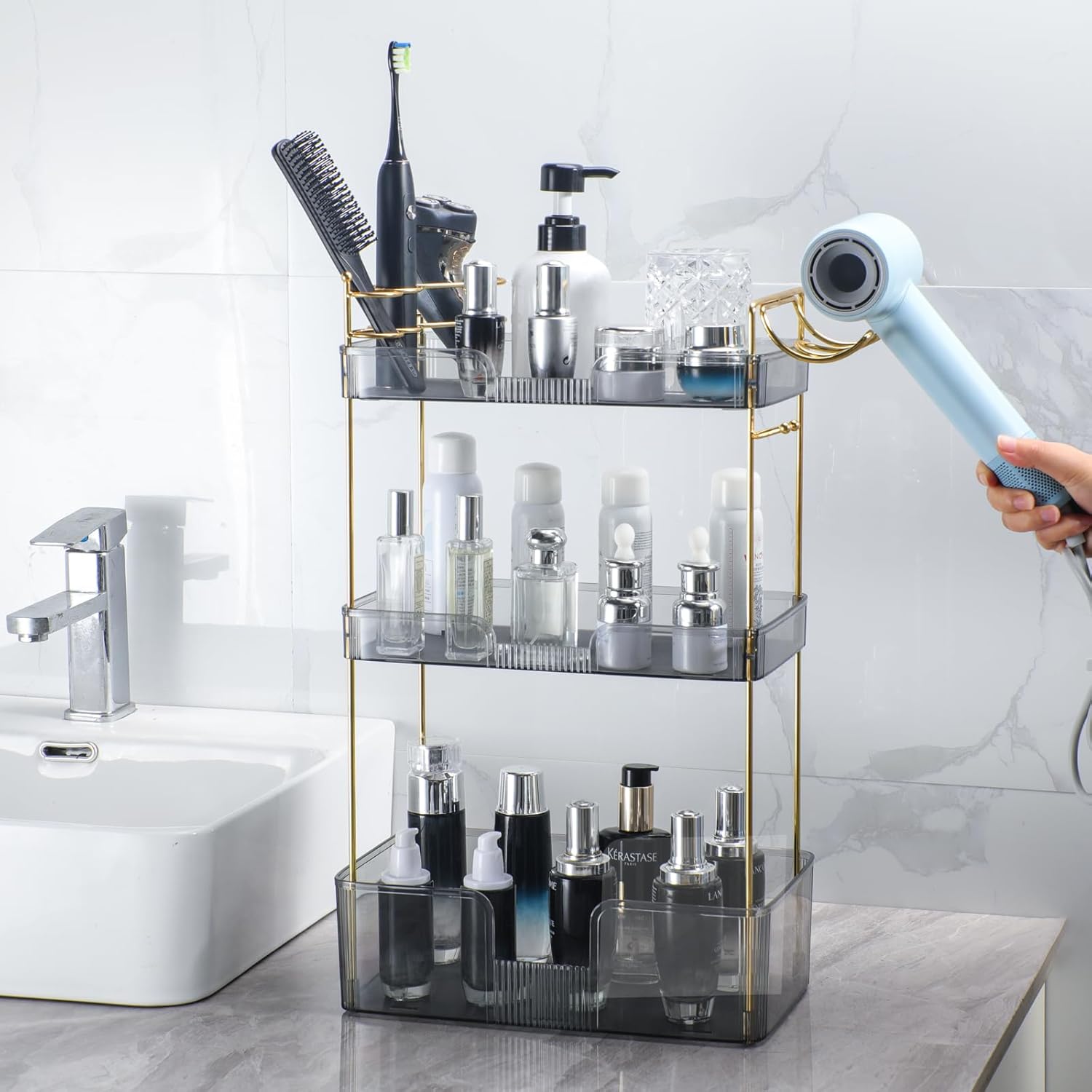 3 Tier Bathroom Organizer Countertop Makeup Perfume Tray Skincare Organizer Comes with Hair Dryer Rack and Toothbrush Holder for Bathroom Dresser Vanity (Grey)