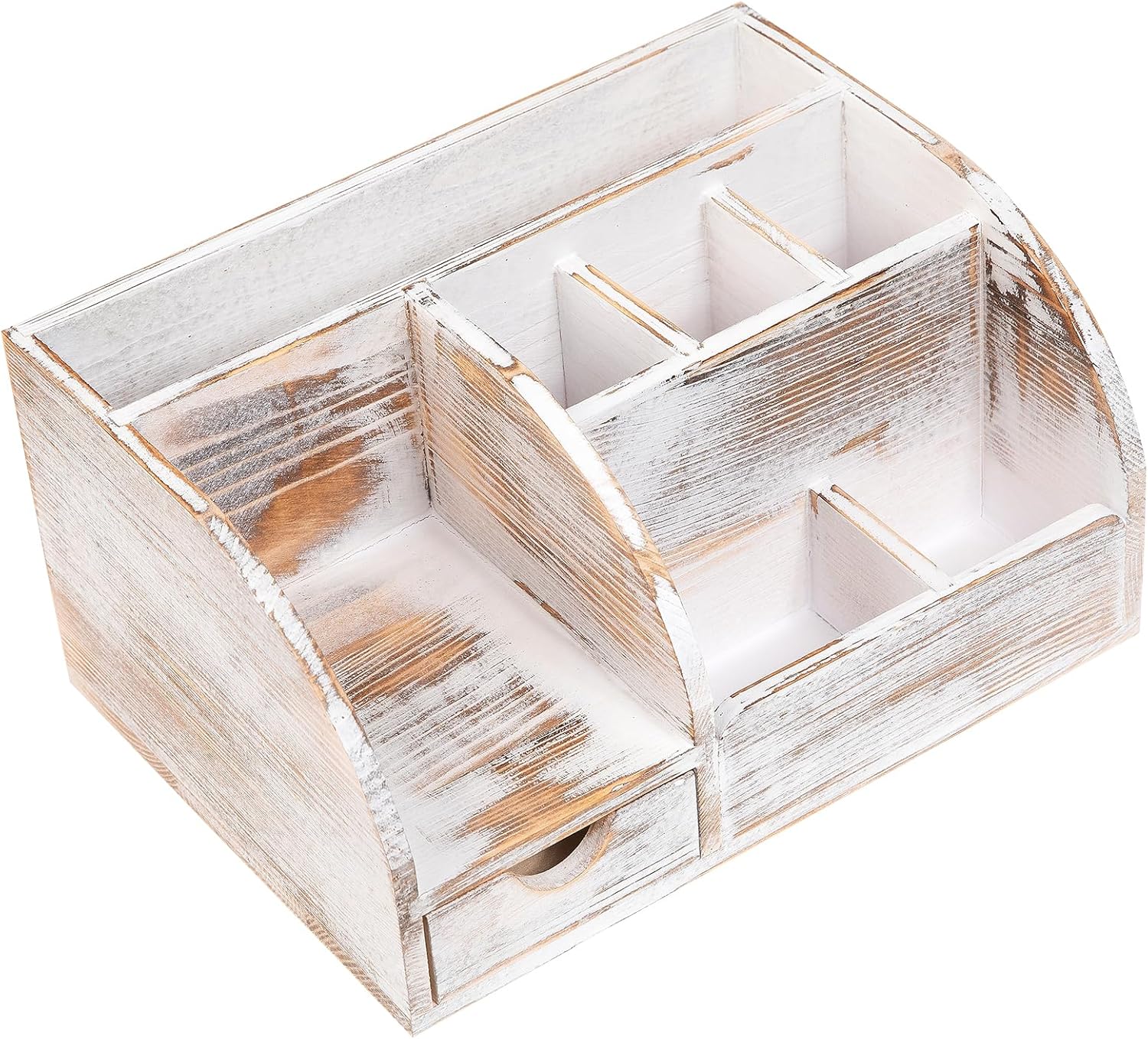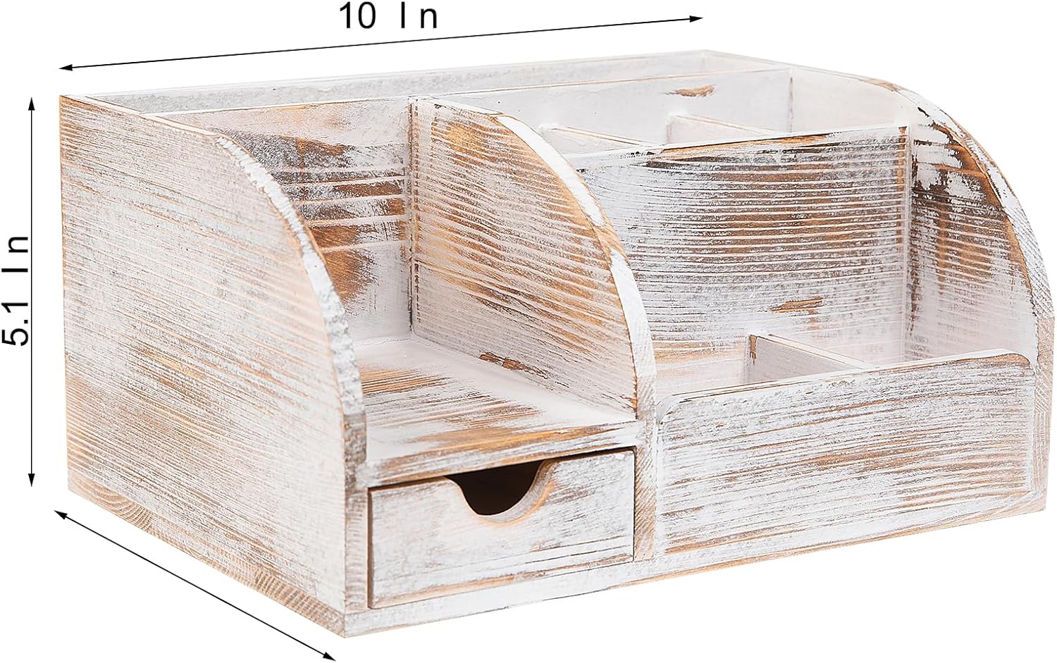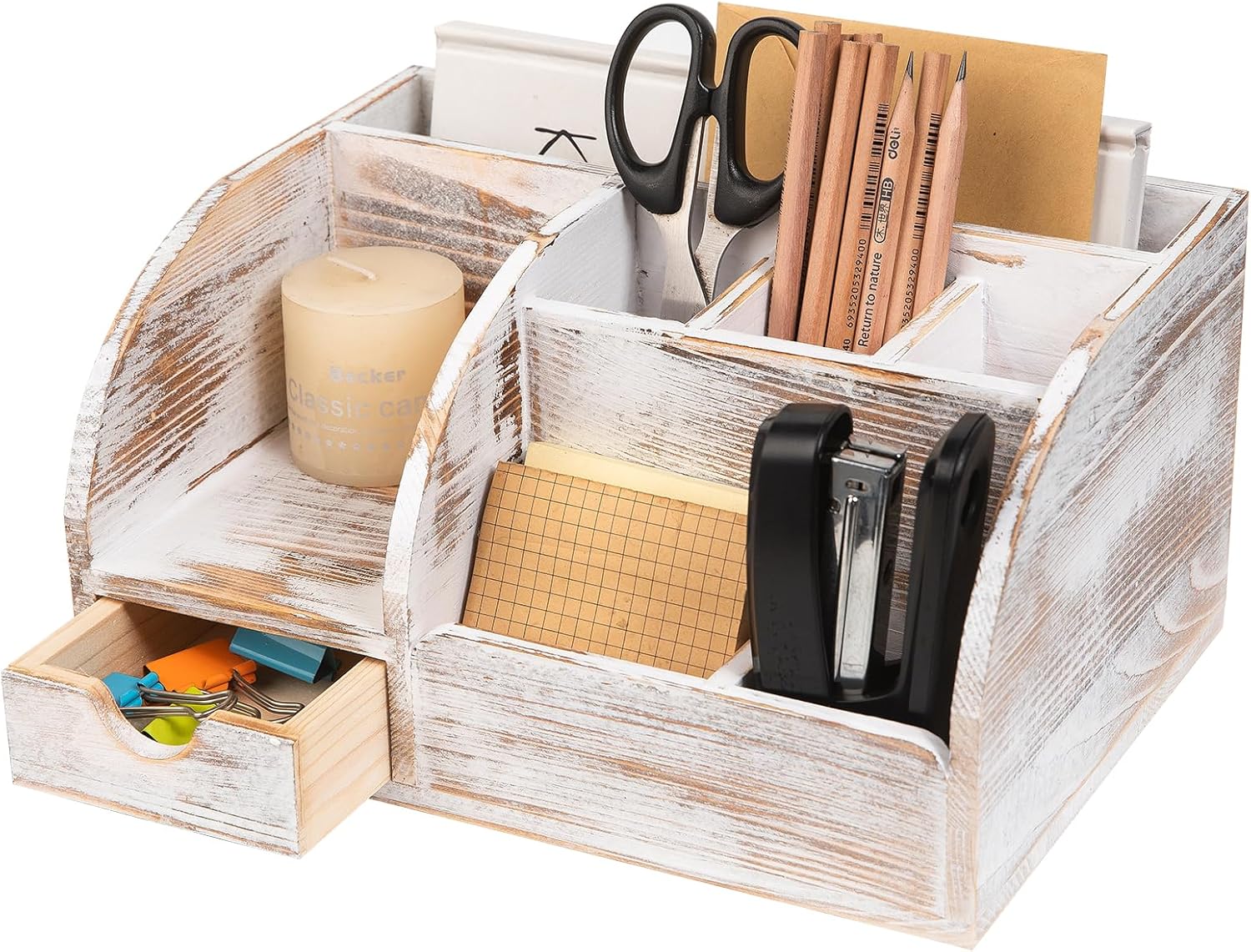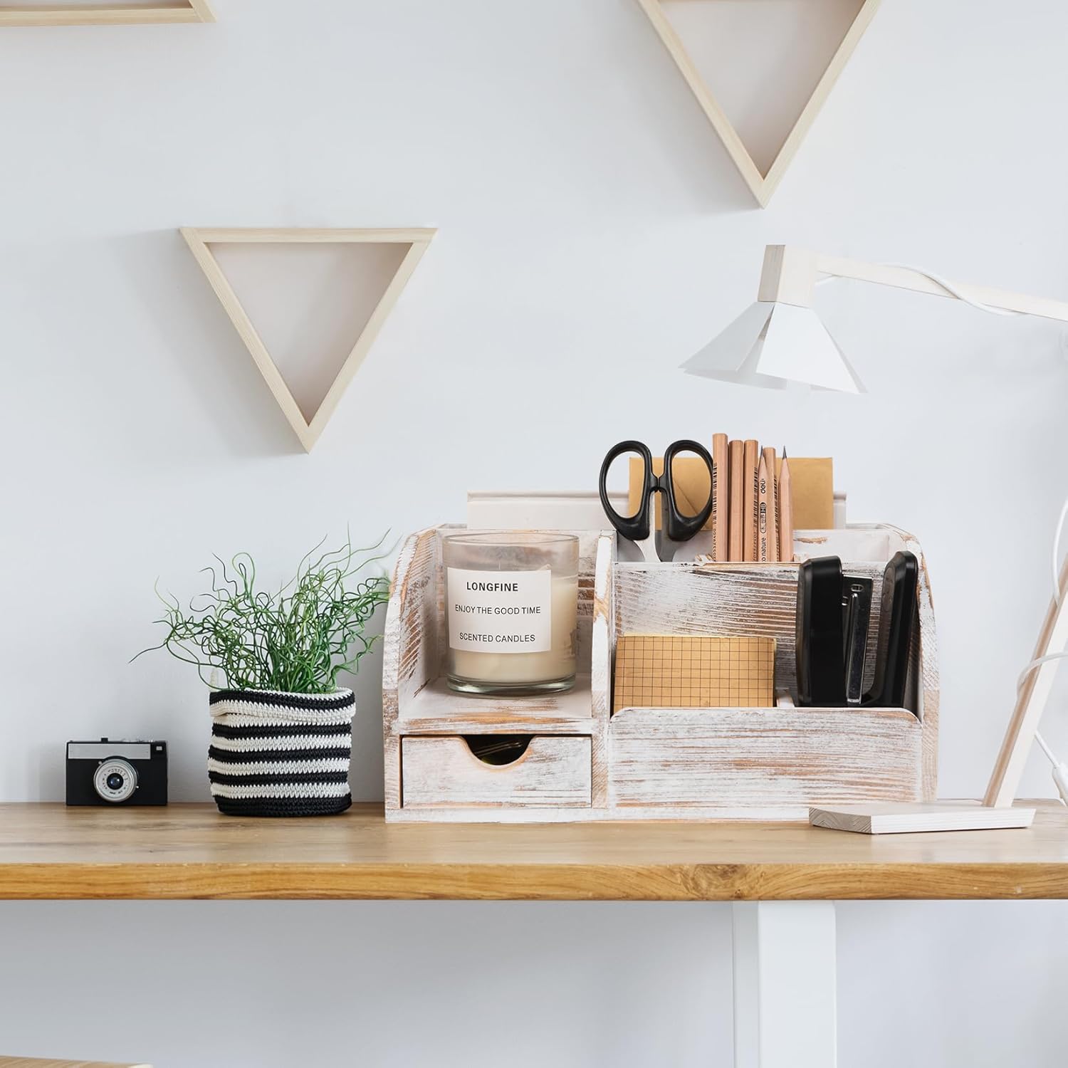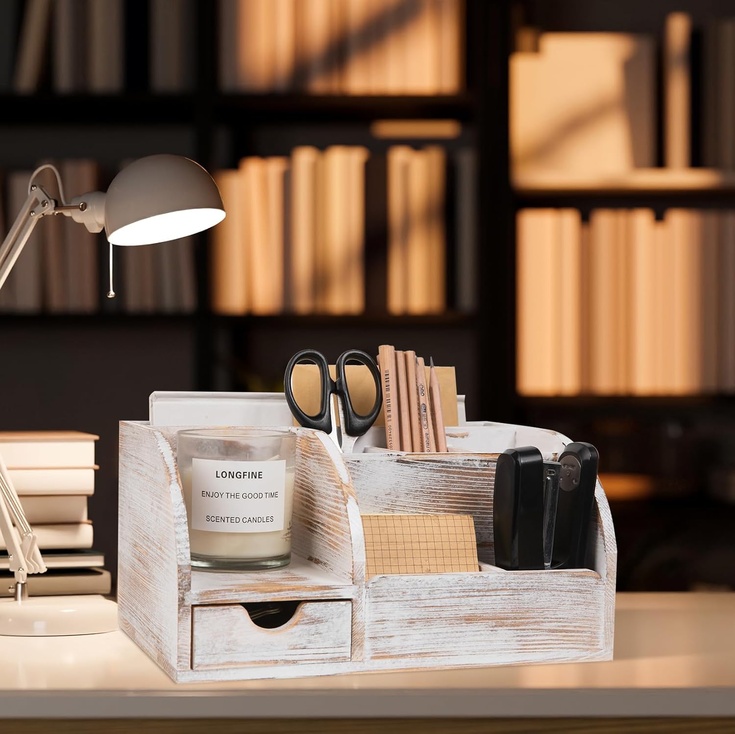 VERGOODR Office Desk Drawer Supply Organizer and Accessories, Wood Desk Organizer with 6 Compartments & 1 Drawer Binders Folder Papers Holder Pen Holder Office Desktop File Organizer (Washed white)