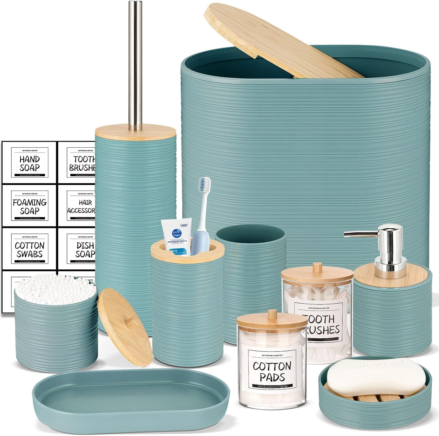 IMAVO Bathroom Accessory Set-11Pcs Blue Bathroom Accessories Set with Trash Can,Soap Dispenser,Soap Dish,Toothbrush Holder,Toothbrush Cup,Toilet Brush Holder,Qtip Holder Dispenser with Labels