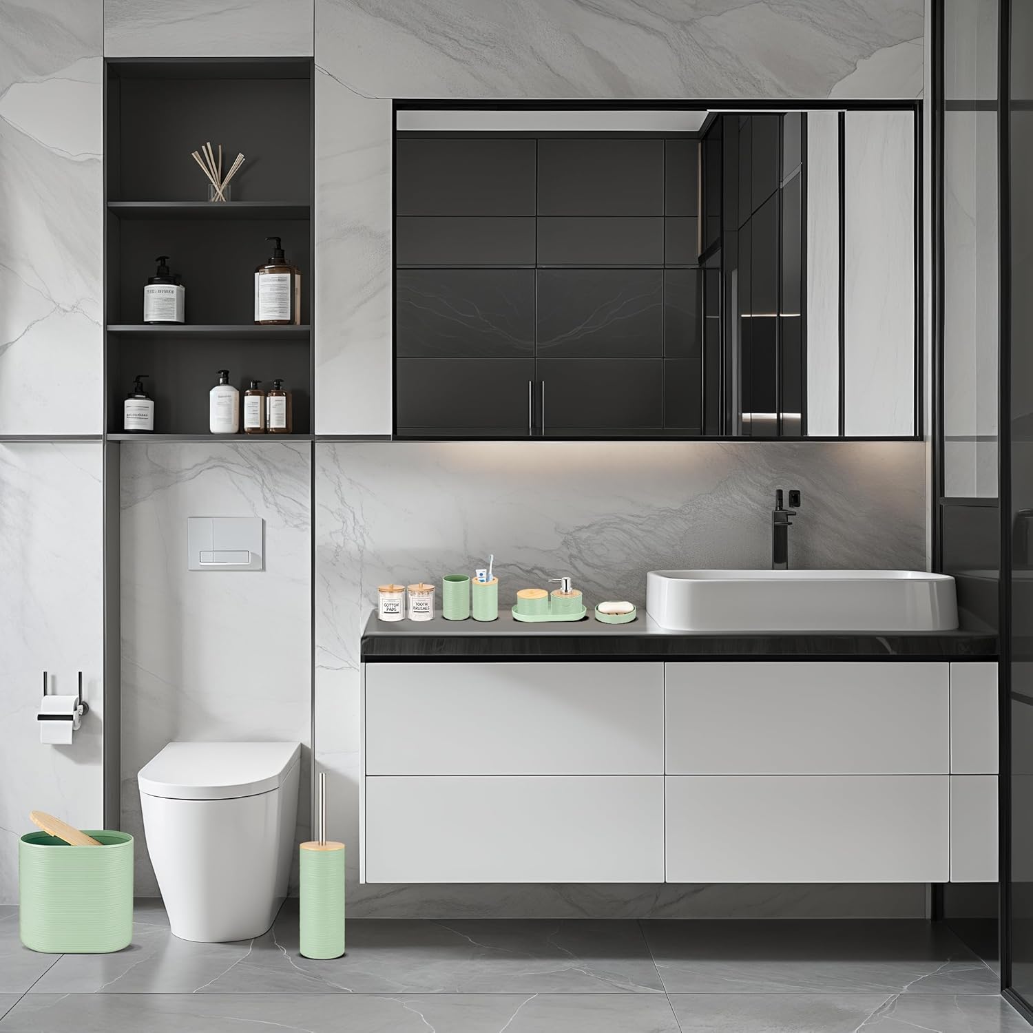 IMAVO Bathroom Accessory Set-11Pcs Green Bathroom Accessories Set with Trash Can,Soap Dispenser,Soap Dish,Toothbrush Holder,Toothbrush Cup,Toilet Brush Holder,Qtip Holder Dispenser with Labels