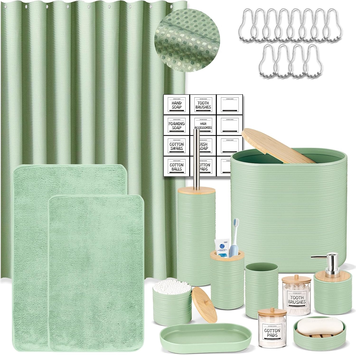 IMAVO Green Bathroom Set,26Pcs Bathroom Accessories Set with Waffle Shower Curtain,Rugs,Trash Can,Tray,Soap Dispenser,Soap Dish,Toothbrush Holder,Toothbrush Cup,Toilet Brush Holder and Qtip Holders