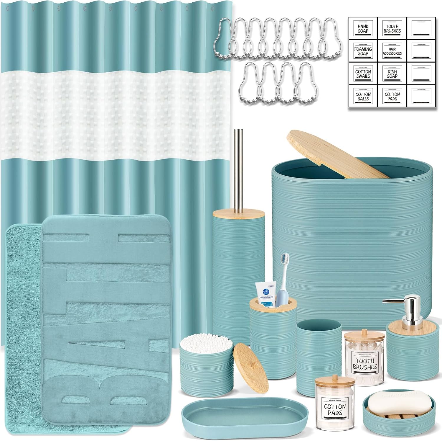- Included Components : 1 Polyester Fabric Shower Shower & 12 Stainless Steel Hooks, 1 Toothbrush Holder & 1 Toothbrush Cup, 1 Trash Can and 1 Toilet Brush & Holder, 1 Tray & 1 Soap box, 3 Q-tip Holder & Lables 1 Polyester Fabric Shower Shower & 12 Stainless Steel Hooks, 1 Toothbrush Holder & 1 Toothbrush Cup, 1 Trash Can and 1 Toilet Brush & Holder, 1 Tray & 1 Soap box, 3… See more