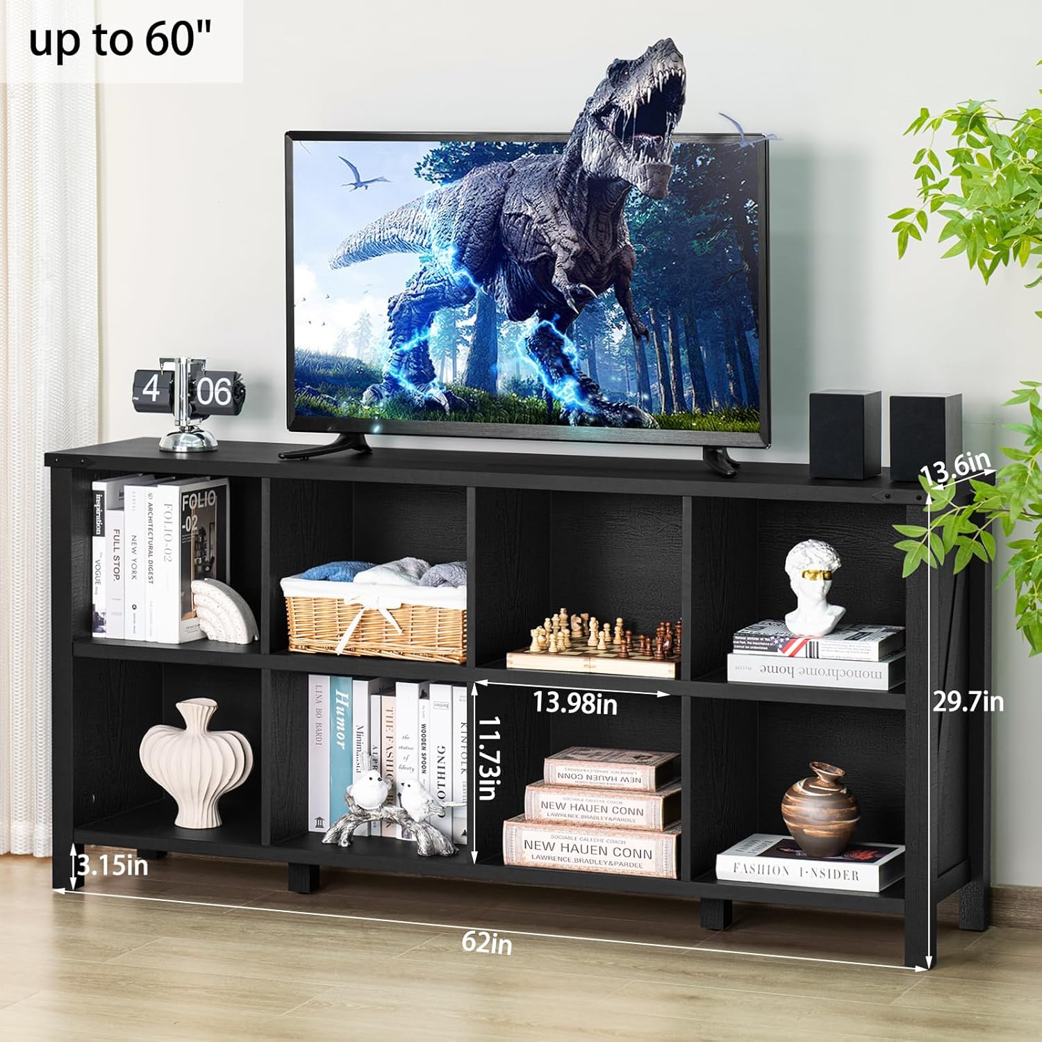 8 Cube Book Shelf, Farmhouse Wood Long Storage Organizer Bookcase, 62" Horizontal Black Console Closet Bookshelf, Hallway TV Stand for Entryway, Display Cabinet Book Case for Living Room