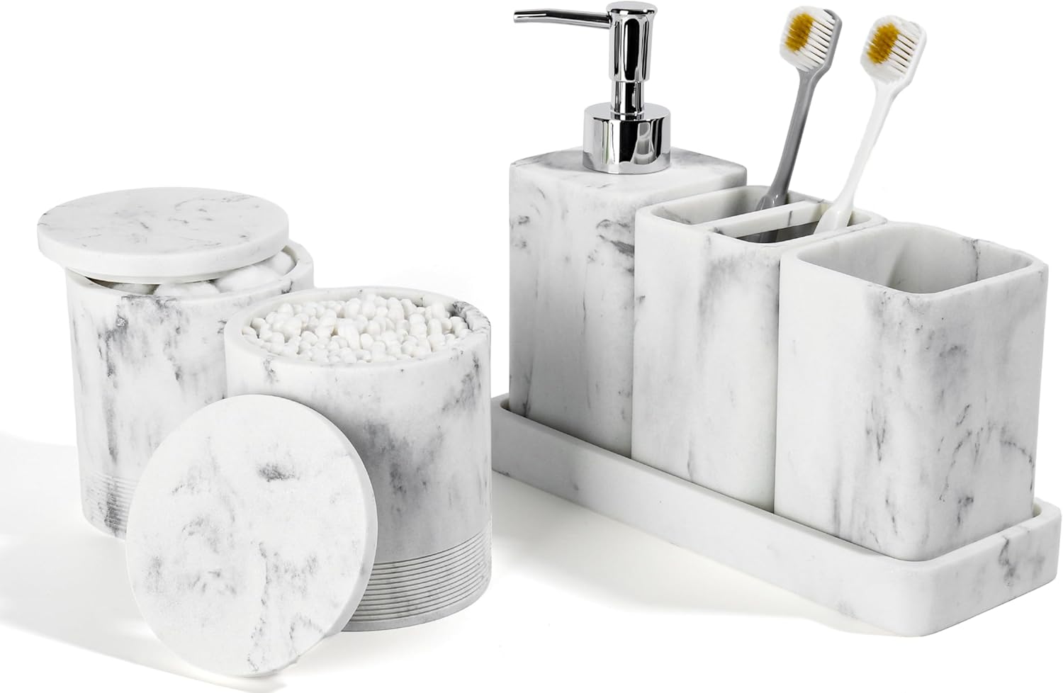 - 6-Piece Bathroom Accessory Set: This premium resin set includes a soap dispenser, toothbrush holder, vanity tray, tumbler, and two jars, all designed to keep your bathroom essentials organized.
