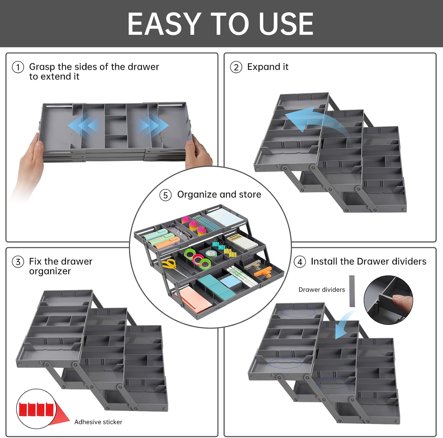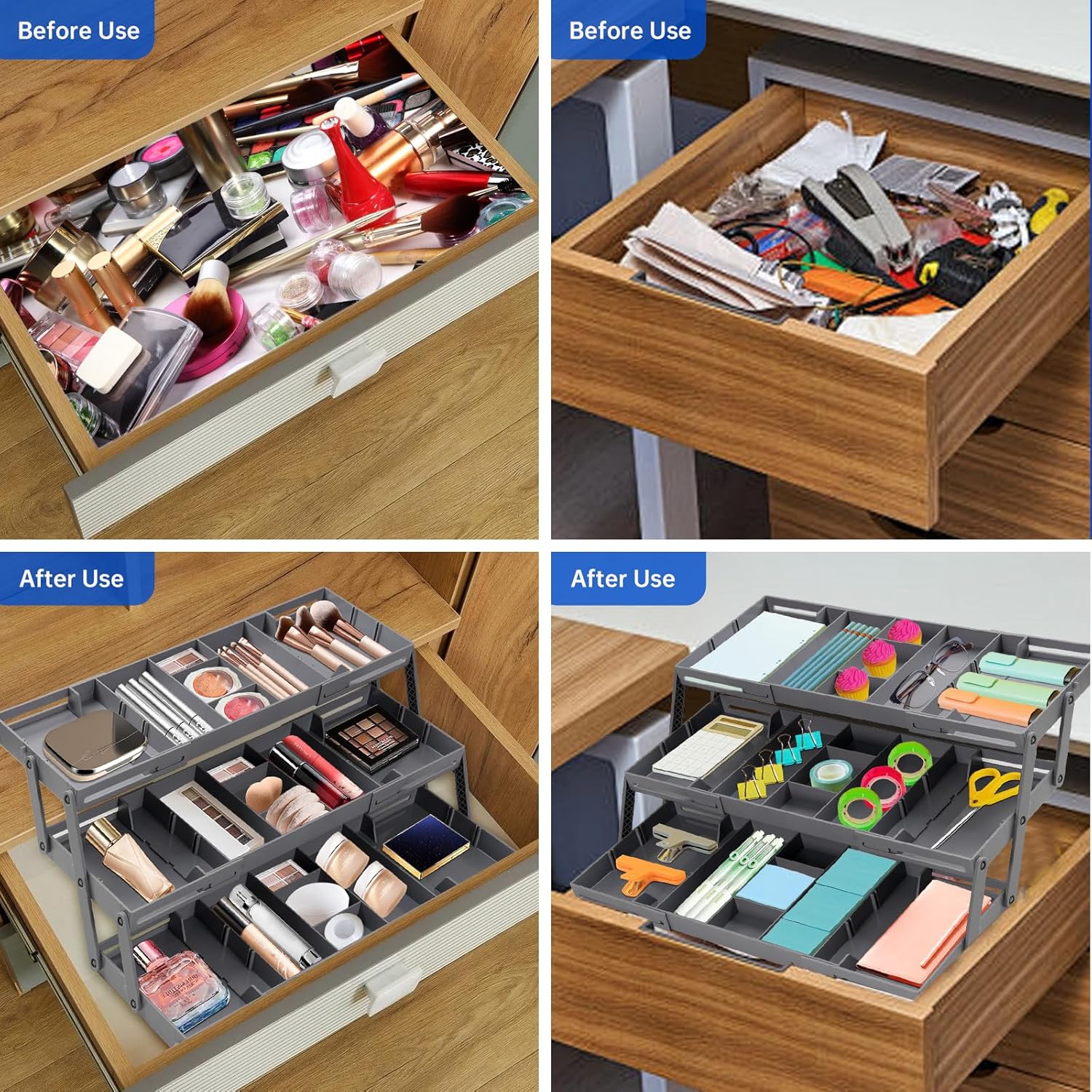 - EXPANDABLE DRAWER ORGANIZER: Say goodbye to mismatched drawer organizer that don’t quite fit your drawers. Our smart drawer organizer multi level is designed to provide the ultimate versatility with its extendable feature, allowing it to stretch from 9.84 inches to 15.98 inches. This flexible range ensures a customized fit for various drawer sizes, whether you’re organizing a compact kitchen utensil drawer or a larger dresser drawer