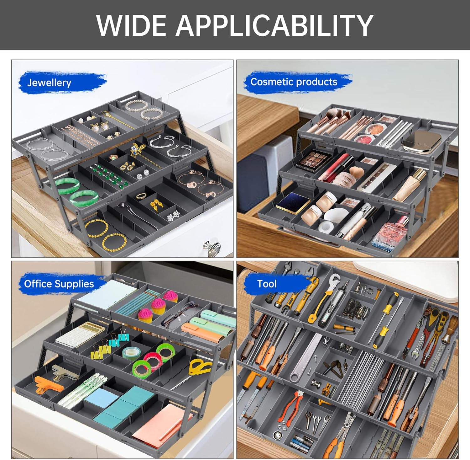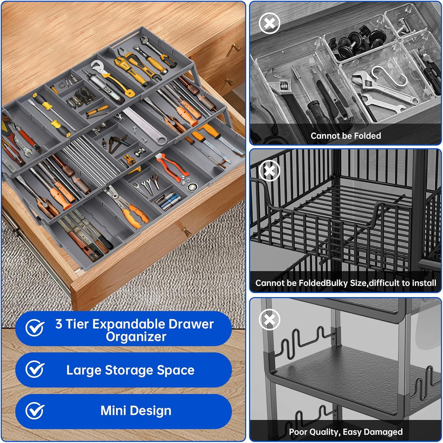 - FOLDING DRAWER ORGANIZER:Maximize your drawer space with our thoughtfully designed smart drawer organizer 3 tier collapsible. Featuring three tiers of organized compartments, it neatly stores office supplies, crafting materials, and small items for easy access.When not in use, the smart drawer conveniently folds down to a compact size, making it easy to store in tight spaces