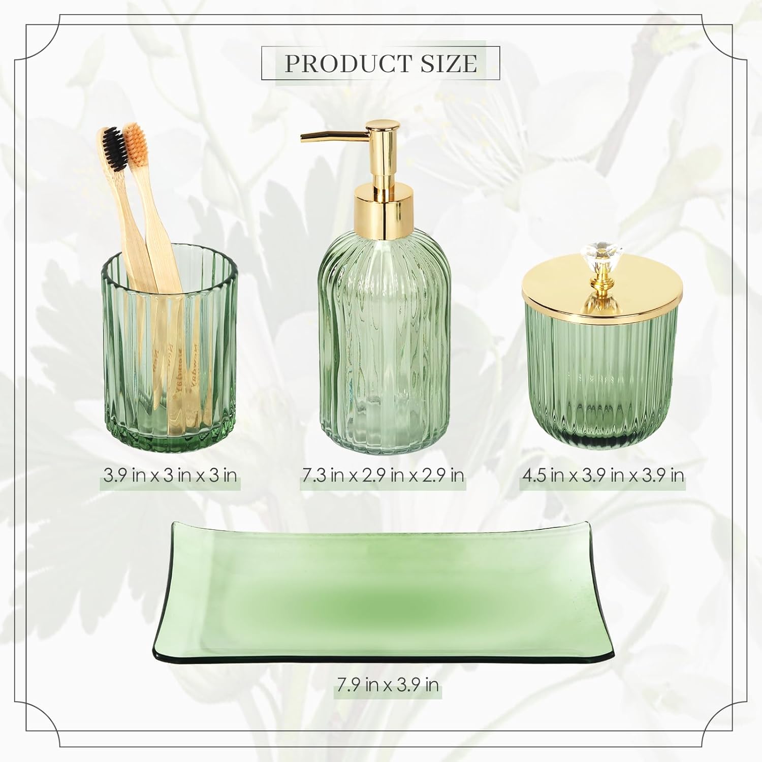 Designer Green Glass Bathroom Accessories Sets - 4 Pcs with Lotion Soap Dispenser, Bathroom Toothbrush Holder, Vanity Tray, and Apothecary Jar, Vintage Bathroom Decor, Gift Countertop Organizer