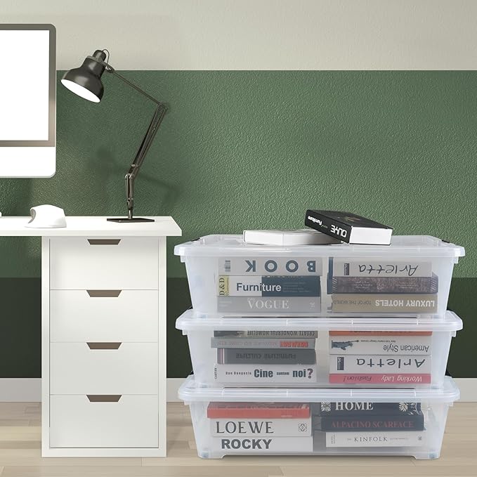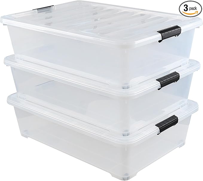 Gloreen 3 Pack Large Under Bed Storage Boxes with Wheels, 50 Quart Clear Plastic Lidded Storage Bins