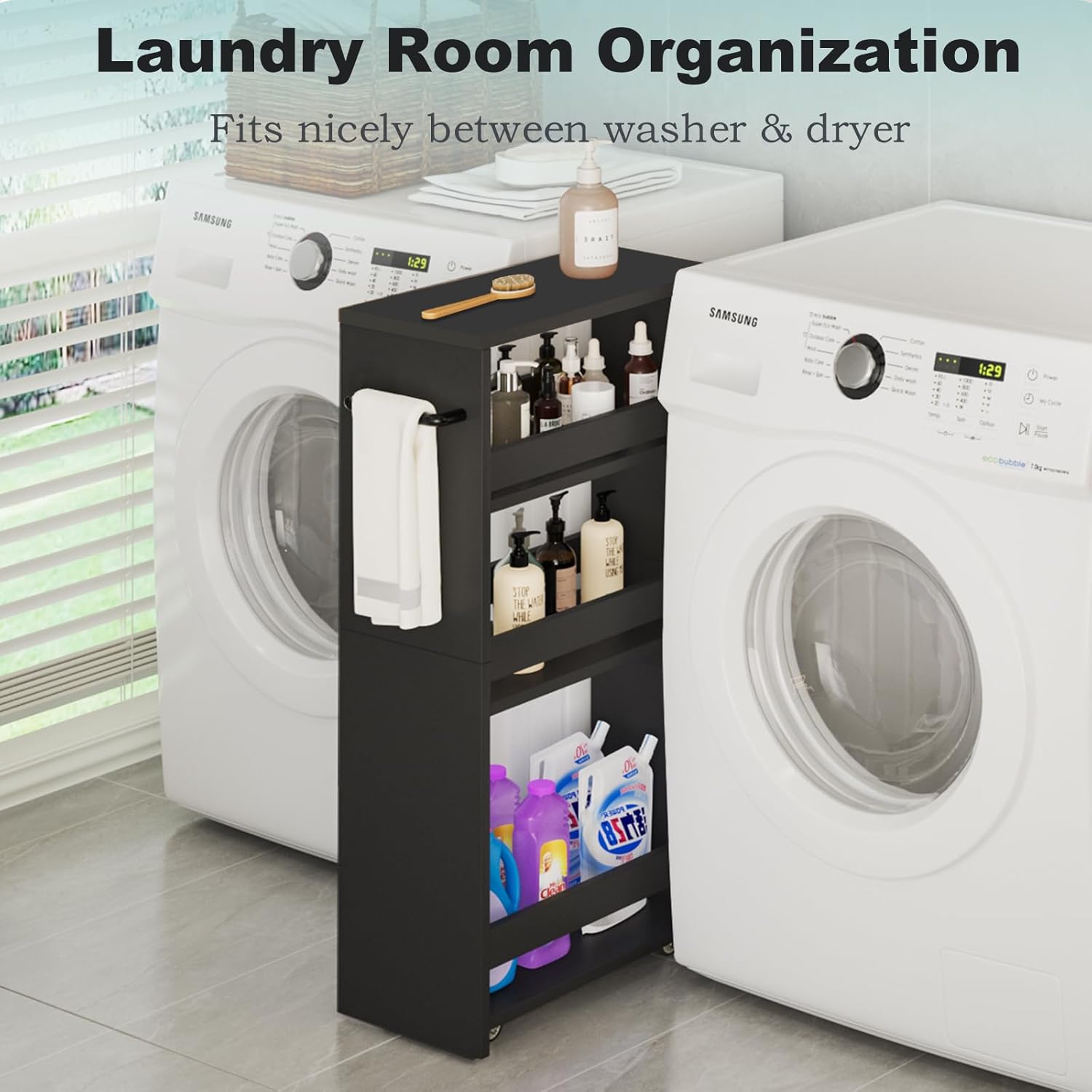MARTY Rolling Storage Cart 7.9" W, 4-Tier Kitchen Cart with Wheels Handle, Slim Storage Cart Mobile Shelving Utility Carts for Bathroom Laundry Room Organization Narrow Places (All Black)