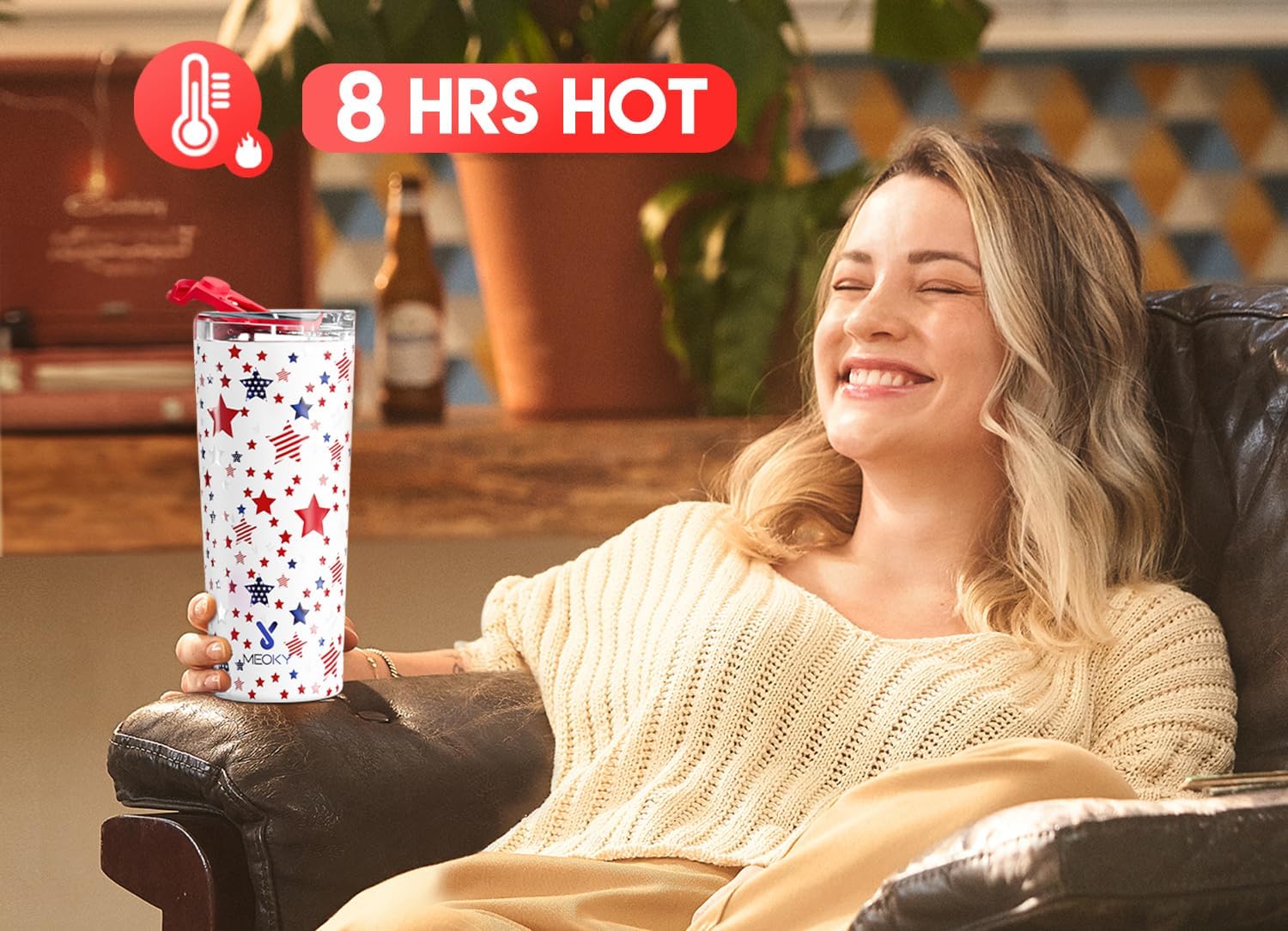 - KEEPS HOT. With double-wall vacuum insulation, Meoky travel mug keeps hot for 8 hours and cold for 24 hours.