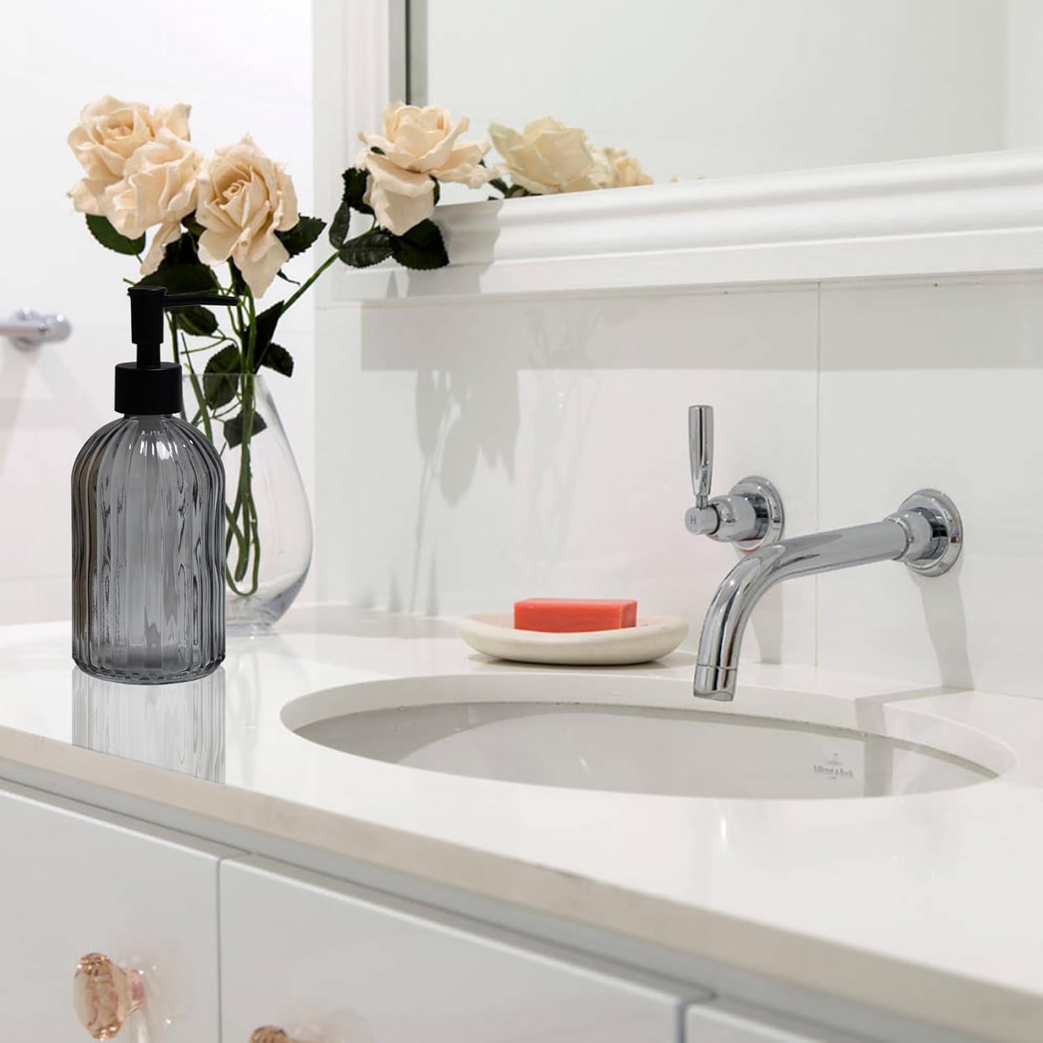 Grey Glass Soap Dispenser with Black Plastic Pump, 13.5oz Refillable Liquid Hand Soap Dispenser, Lotion Dish Soap Dispenser for Modern Home Decor, Bathroom, Kitchen Countertop, Hotel