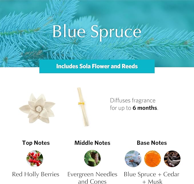 - Luxury Blue Spruce Diffuser Set: Add this gorgeous blended natural oil and one flower pine scented reed diffuser to your home decor or use the handcrafted room perfume scented sticks in oil as an impressive luxury home gift
