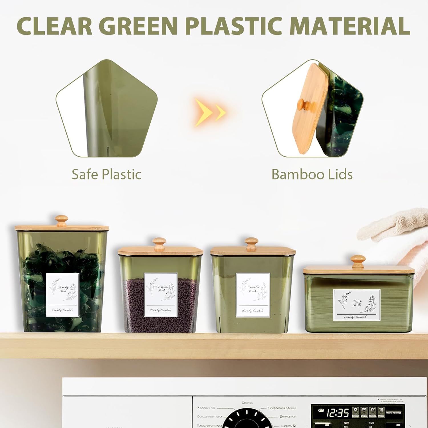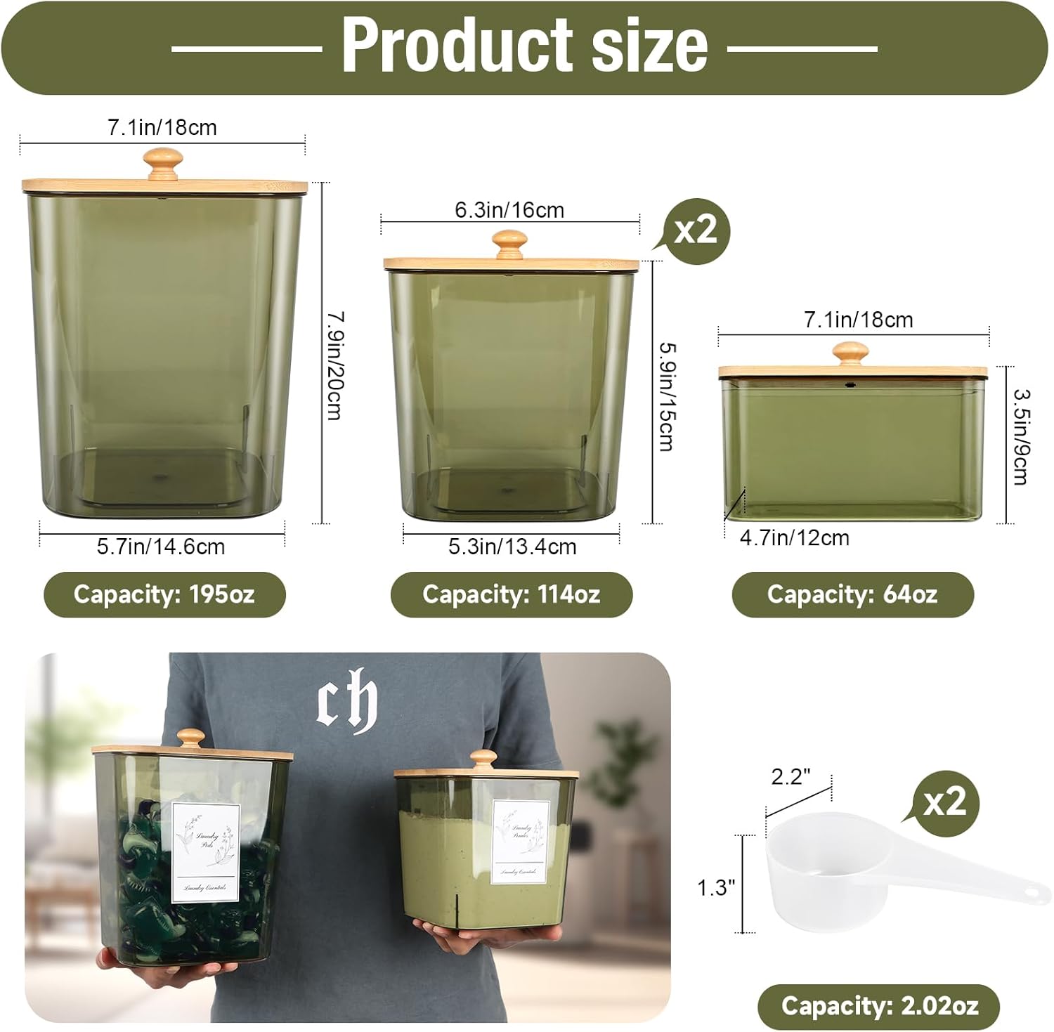 - PRODUCT INCLUDES: 1 large 195oz clear green laundry jar with lid, 2 medium 114oz clear green square laundry jars with lids, 1 square 64oz dryer sheet container with lid, two spoons (4.92"x2.16"x1.34", 2.02oz), and 16 beautifully designed labels