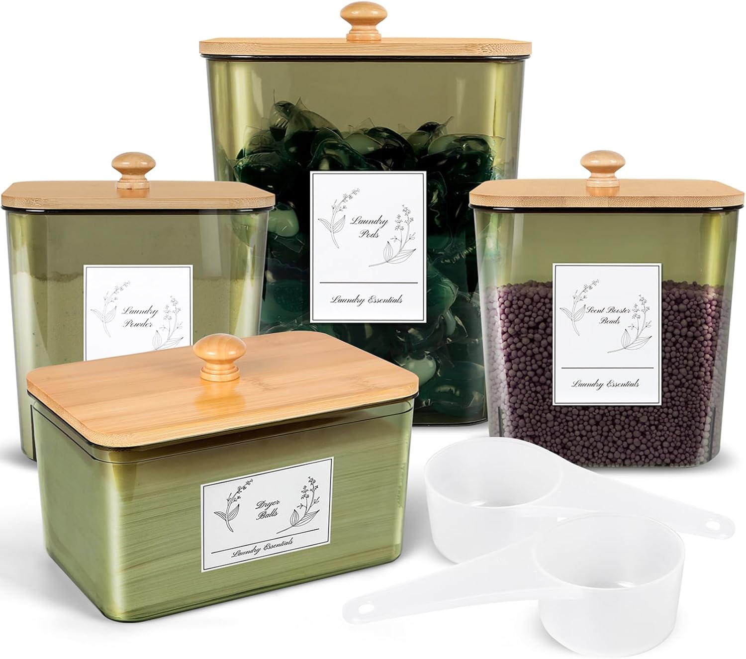 4 Pack Laundry Pods Container & Dryer Sheet Holder, Plastic Pod Holder with Lids & Scoops, Laundry Room Organization and Storage Sets for Powder, Detergent, Scent Booster