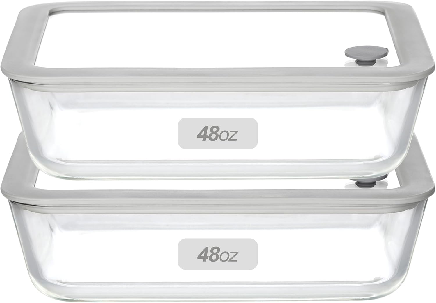 - ✅2 SETS OF LARGE SET: Each set comes with the glass containers and grey silicone framed glass lids. 2 Pack of Rectangle Shape Size : 48oz, (7x9x2.5,)