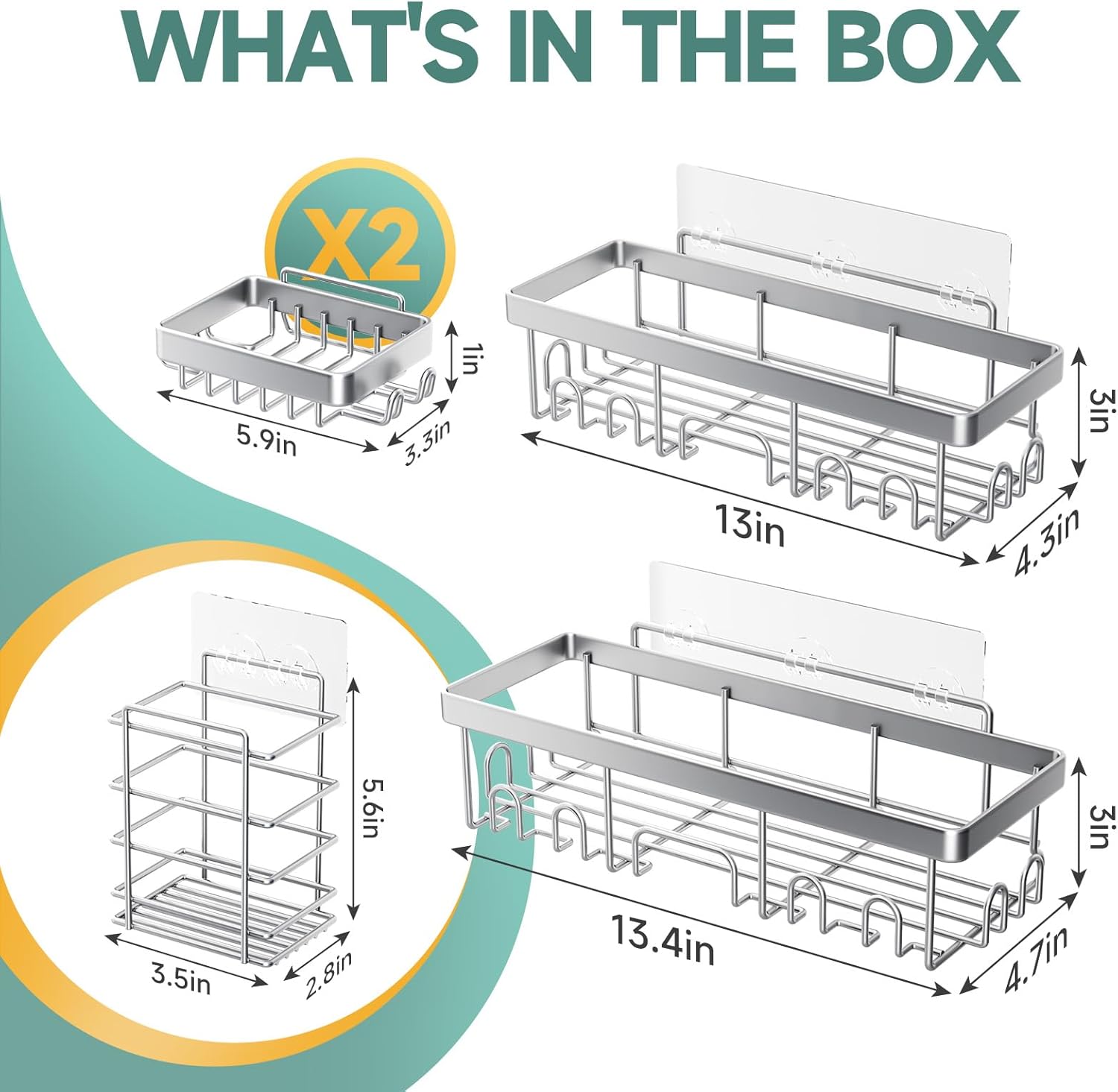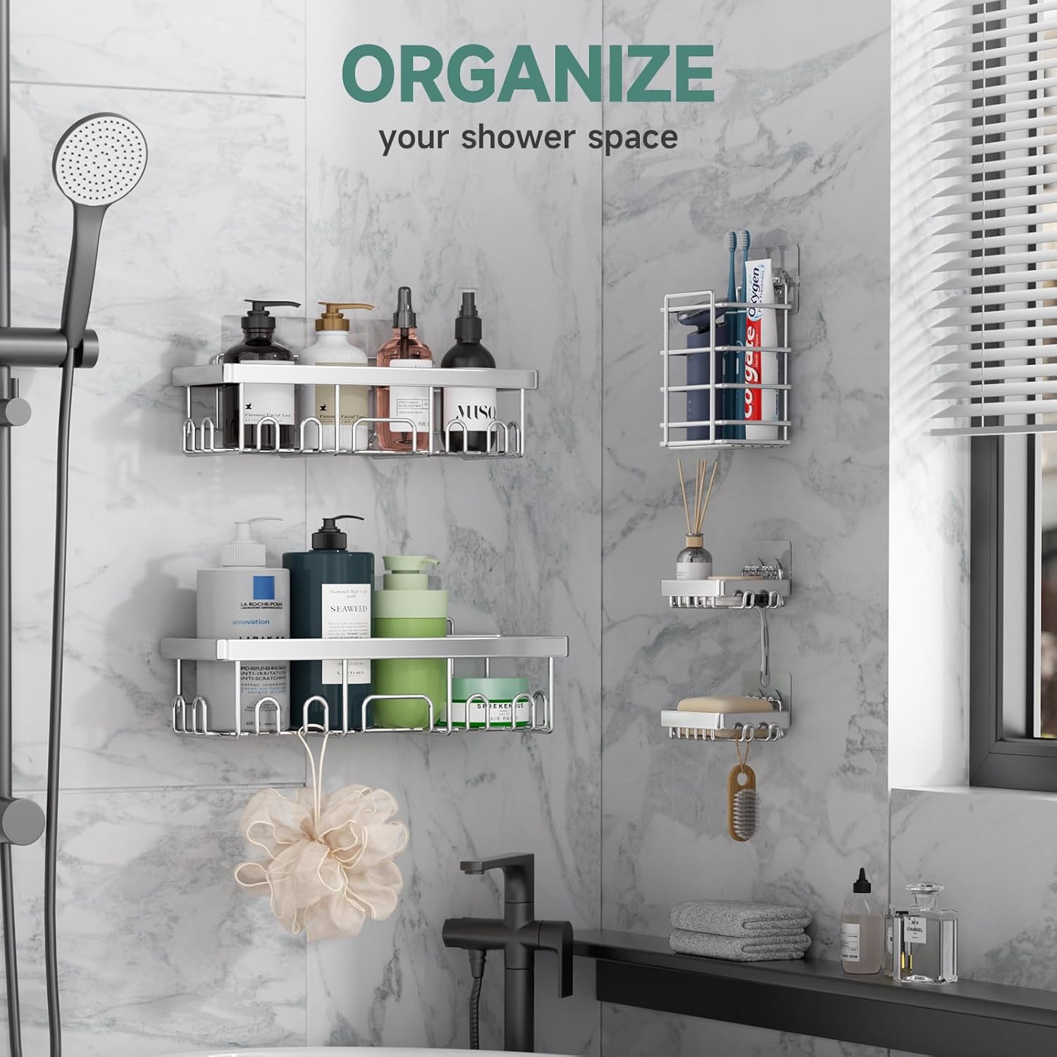 Veken Adhesive Shower Caddy 5-Pack,Heavy Weight Bearing,Large Wall Mounted Shower Shelves Rack,Organizer Storage Accessories with Soap Dish&Toothbrush Holder,Ideal for Bathroom,Home&Kitchen,Silver