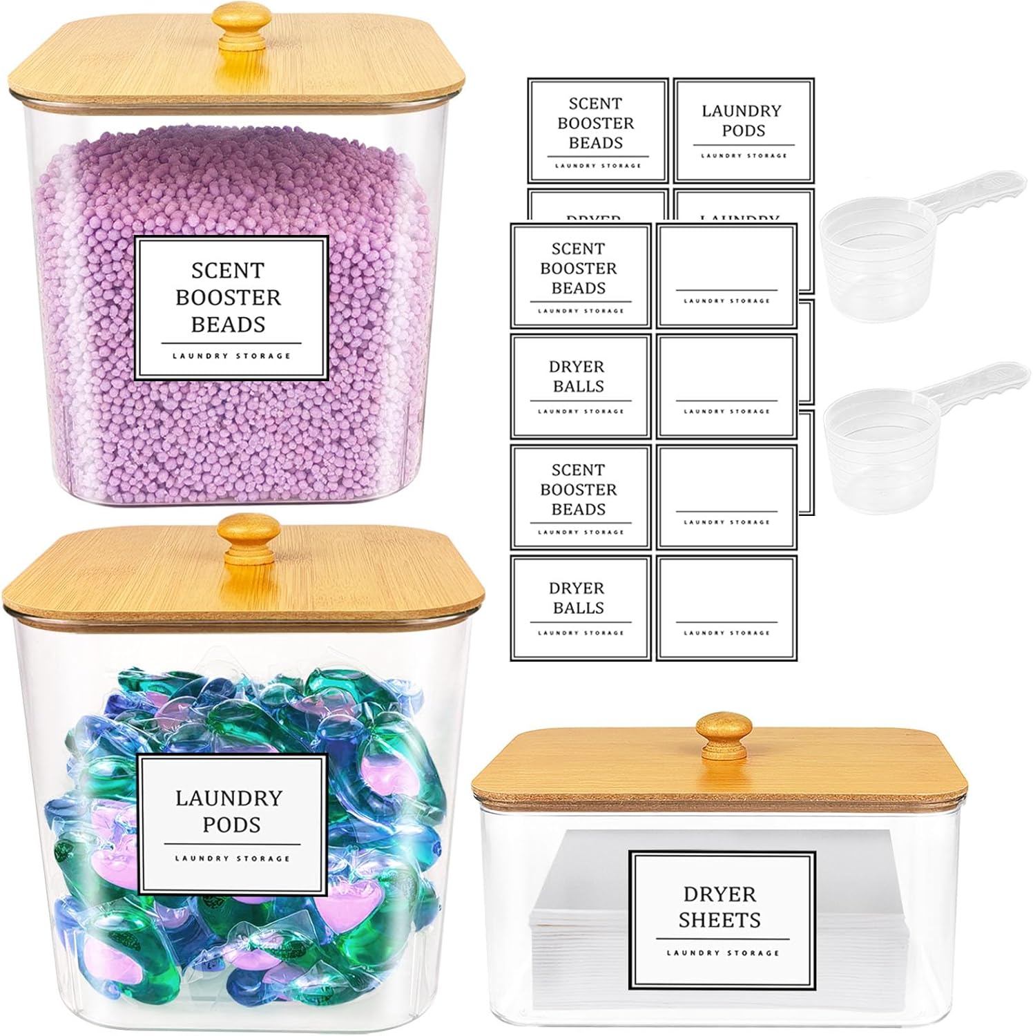 - 【Laundry Pods and Dryer Sheets Container Set】 This laundry scent booster container set includes clear containers with wooden lids (0.66 Gal/84 OZ) x2,dryer sheet holder x 1, scoops x2, waterproof labels x16. Laundry containers perfect for organizing and storing items in your laundry room, kitchen, bathroom, and other areas of your home. These laundry detergent container are dishwasher safe, while the wooden can be easily wiped clean with a damp cloth.