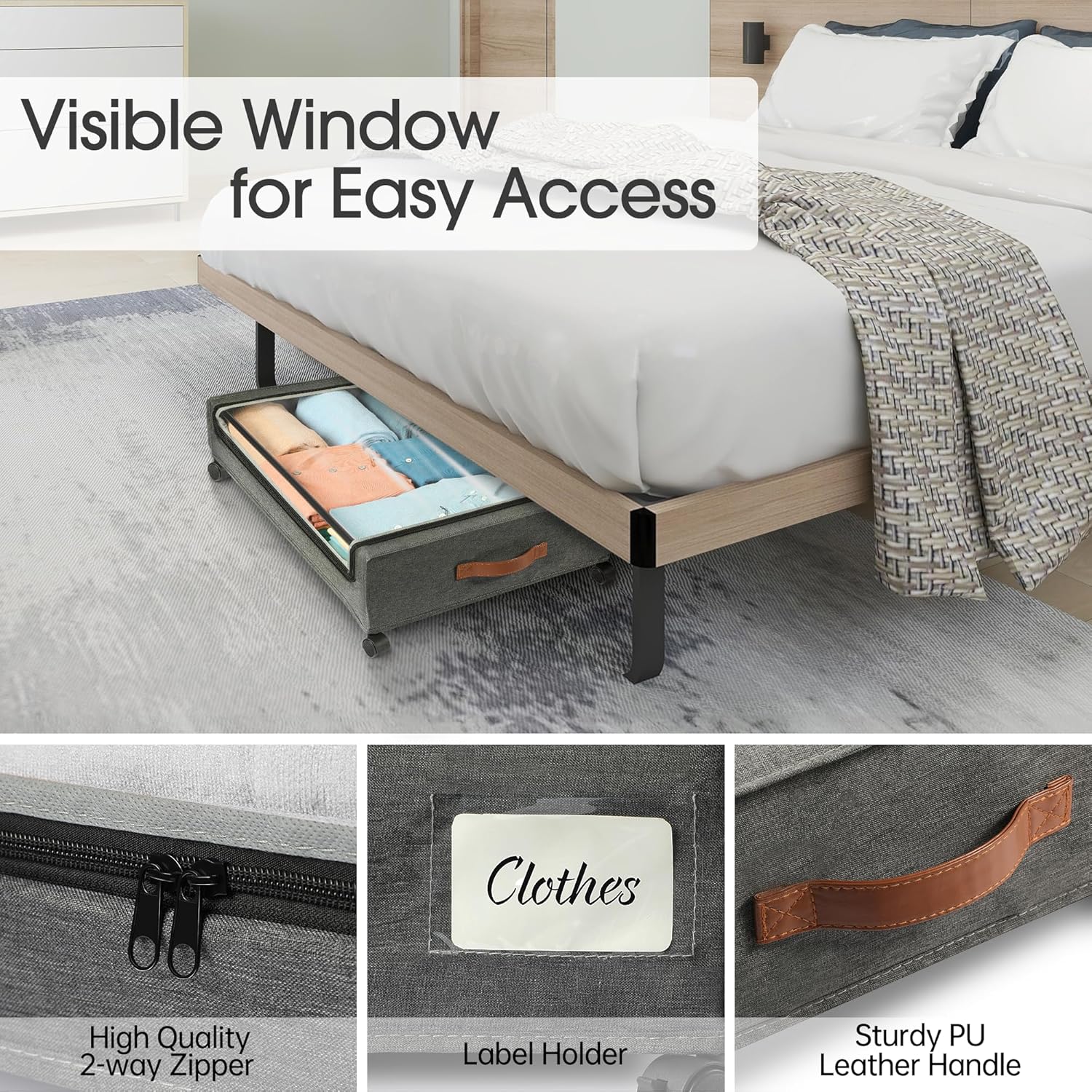 Yecaye Under Bed Storage with Wheels, 4 Pack 60L Under Bed Rolling Storage with Clear Window & Label, Underbed Storage Containers, Rolling Under Bed Metal Drawer for Clothes, Shoes, Books