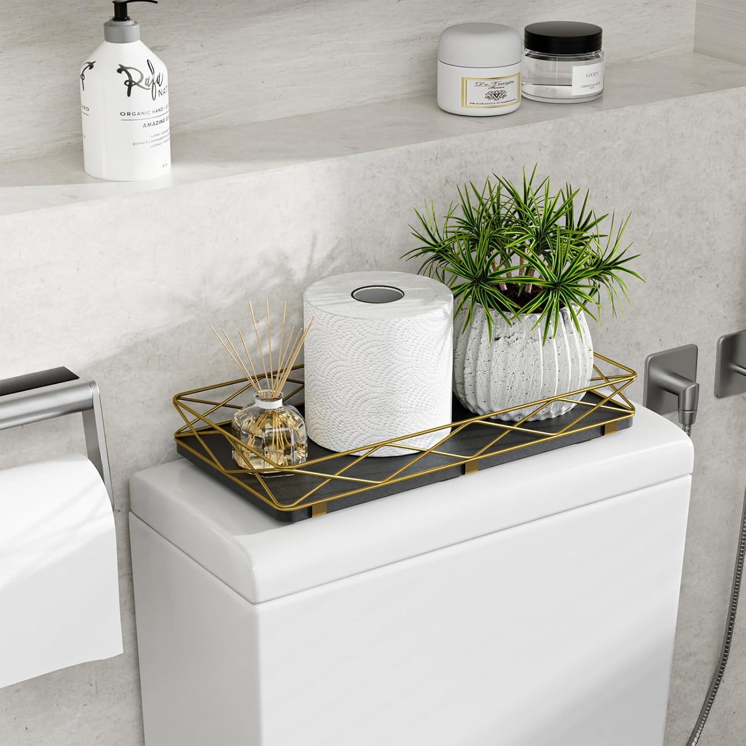 - Multiple Functions: Elevate your daily routine with our toilet tank basket tray: used it as bathroom tray to organize bathroom essentials like toilet paper roll, lotions, scented candles, hairbrushes, etc. Add a touch of elegance to your dresser by using the vanity tray to display perfumes, jewelry, and cosmetics; Using it as guest towel holder in bathroom or on dinning table to impress your guest