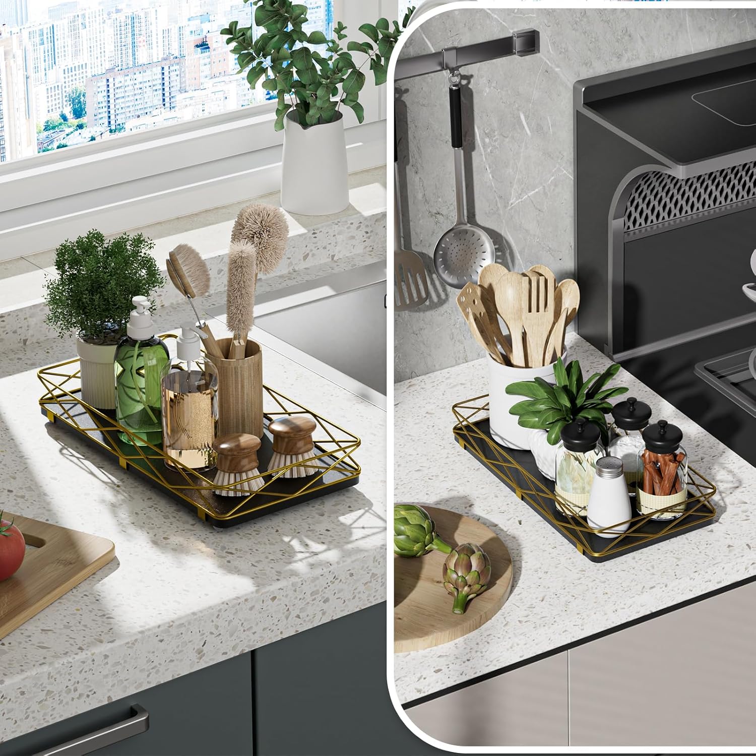 Toilet Paper Basket Holder, 13" Bathroom Tray Countertop, Wood and Metal Toilet Tank Tray Bathroom Vanity Organizer for Toiletry, Kitchen Sink Organizer for Soap Dispenser (Black + Gold)
