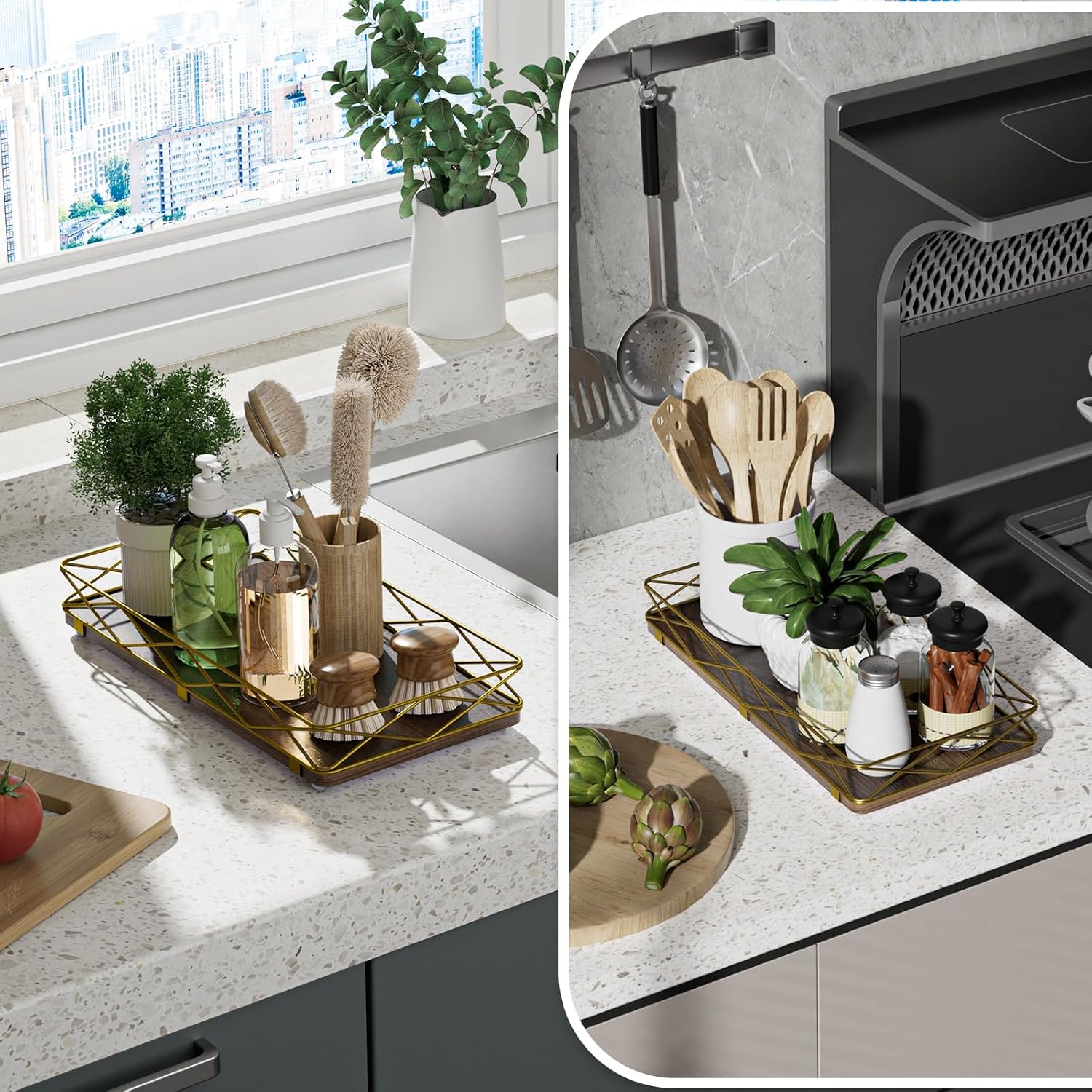Toilet Paper Basket Holder, 13" Bathroom Tray Countertop, Wood and Metal Toilet Tank Tray Bathroom Vanity Organizer for Toiletry, Kitchen Sink Organizer for Soap Dispenser (Brown+Gold)